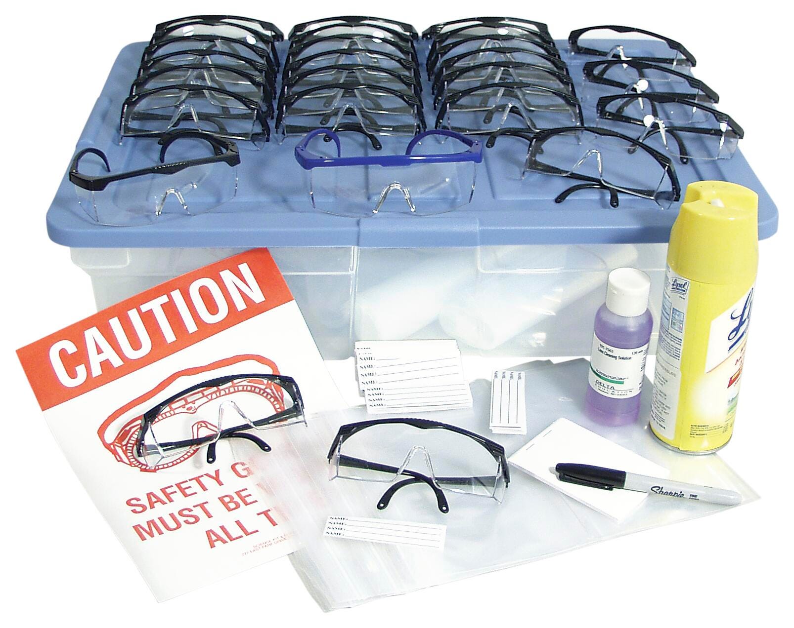 Delta Education Safety Glasses Kit is used to demonstrate the importance of safety in classroom or lab and includes one pair of adult-sized and 30 pairs of student-sized goggles. Convenient safety kit also includes lens paper, cleaning solution, disinfectant, safety sign, name labels, marking pen and glasses storage bags. Sold in a 30-pack.Features