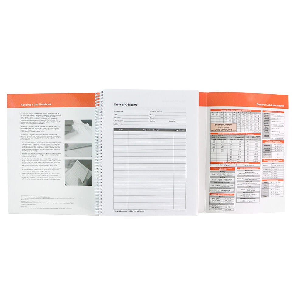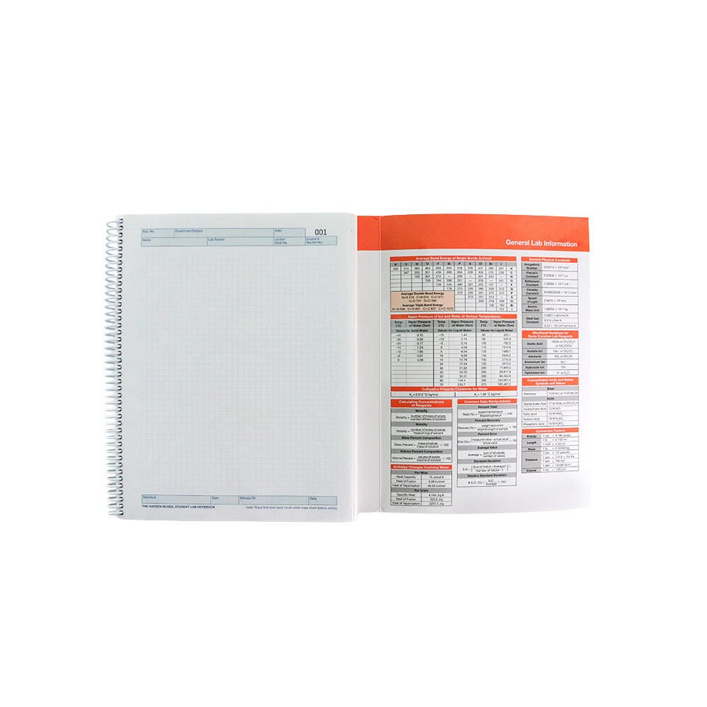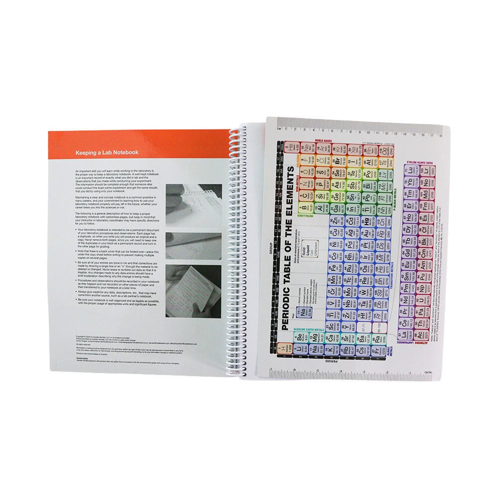 Chemistry Student Lab Notebook featuring carbonless sets is provided with fully laminated front and back covers to protect against lab spills. Cover is featured with updated periodic table that offers great support to your studies. Permanent top bound notebook of 100 pages has unique back cover that folds over to avoid bleed through and between sets. It contains "Table of Contents" for students to keep track of their labs. It is also provided with "How to Keep a Laboratory Notebook" guidelines from Dartmouth and "Laboratory Safety" guidelines for convenience. It is featured with 3-hole punched paper and tear-off ruler. Notebook, measuring 8-1/2 L x 11 W inches, comes with sequentially numbered pages and has signature blocks for student/witness. Notebook is featured with high-quality BPA-free NCR white paper for durability.Features