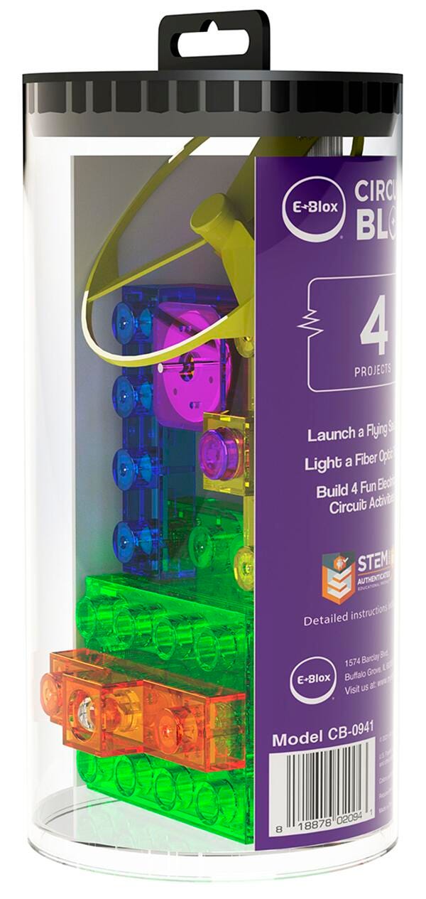 This kit provides hours of fun and educational play. The colorful building blocks contain electronic components such as a battery module, switches, LEDs, and a motor. Build 4 different 3D circuits that teach STEM. lluminate a color changing fiber tree and spin a motor to launch a fan high in the air!Features
