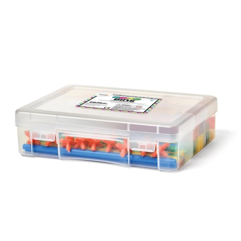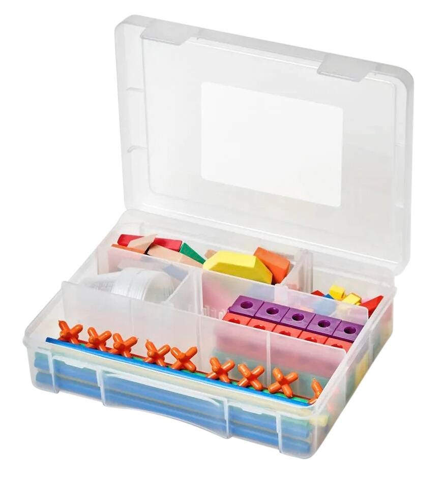 The Learn & Play STEM Bins pack offers individualized and hands-on exploration of basic engineering concepts. Students can create, invent, and solve problems using their own set of maker materials. Each comprehensive bin includes 6 double-sized Task Cards that guide budding engineers through thoughtfully designed real-world challenges, a write-on/wipe-off Blueprint Card for planning, and 6 different building materials in a compartmented plastic storage tote. This kit is designed for students grade K through 5. Colors of all components will vary.Features