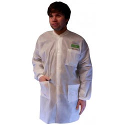 - Fluid-resistant, latex-free lab coat is durable enough to be worn more than one time