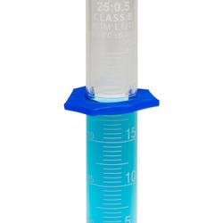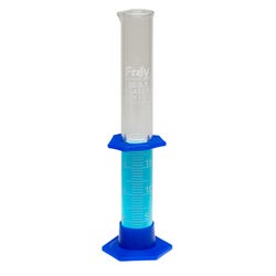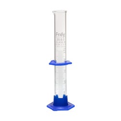 This pack of cylinders from Frey Scientific complies with ASTM E1272, Class B standards for general-purpose lab use. Each borosilicate glass cylinder is calibrated to contain and has a double metric scale, a 25 mL capacity, and 0.5 mL graduations. They feature a pour spout, heavy uniform wall tubing, plastic hexagonal bases, and bumper guards to prevent accidental breakage.Features