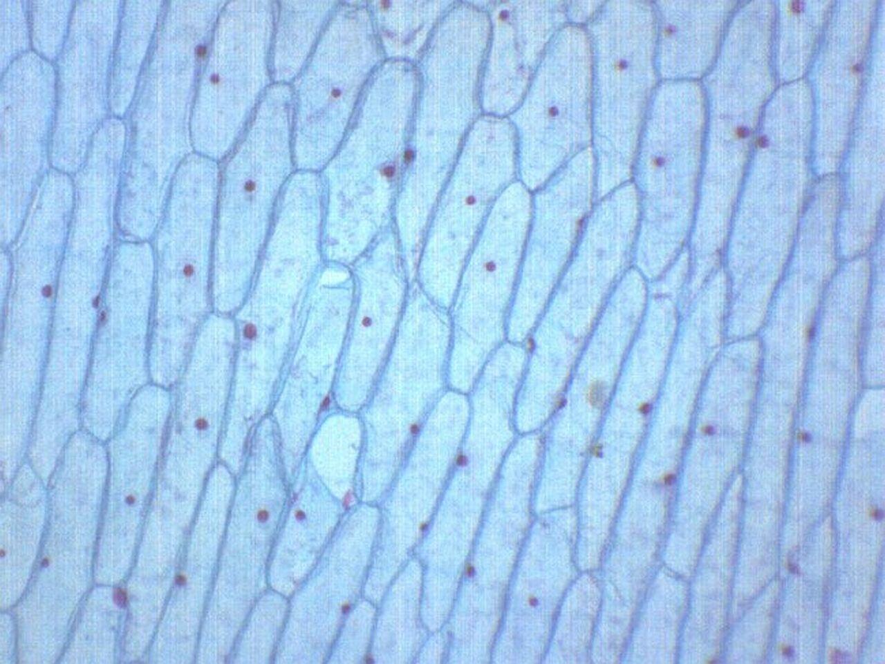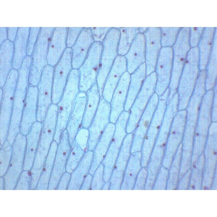 This prepared microscope slide displays the epidermal cells of Allium cepa (onion). This flat mount specimen shows typical plant cells with nuclei, cytoplasm, and cell walls.Features