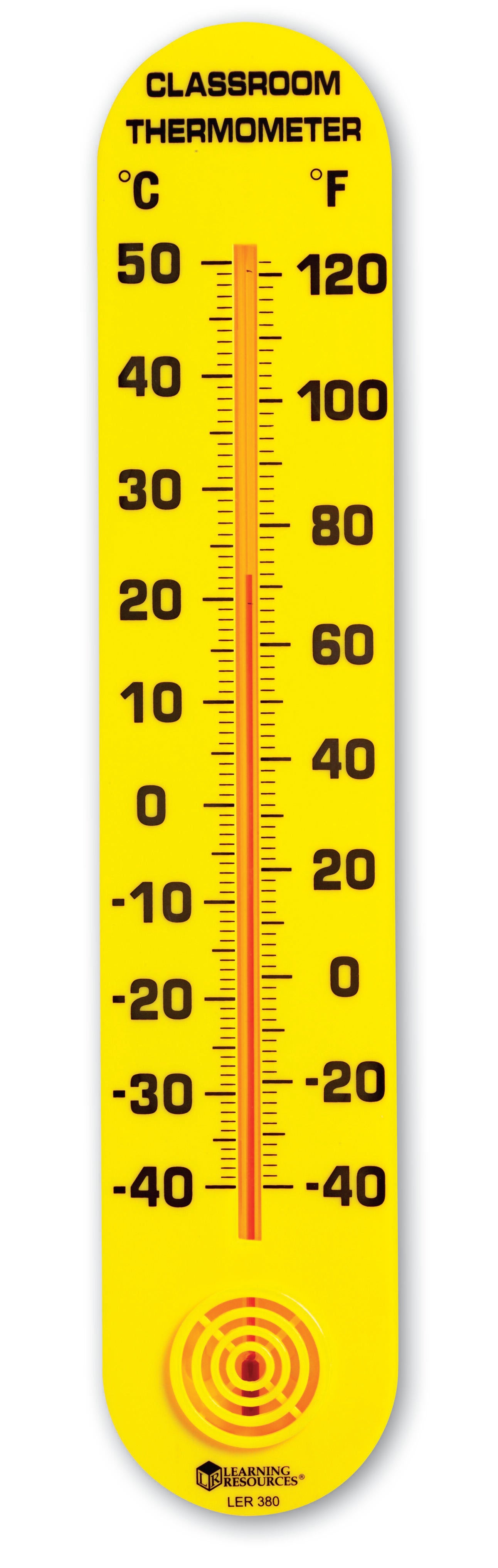 Go beyond hot and cold with this easy-to-read wall-mounted thermometer. Assign a different student each day to read the temperature in Celsius and Fahrenheit. For indoor or outdoor use. Recessed tube prevents accidents. Temperatures range from -40 to 50 degree Celsius and -40 to 120 degree Fahrenheit. Ages 6 and up.Features
