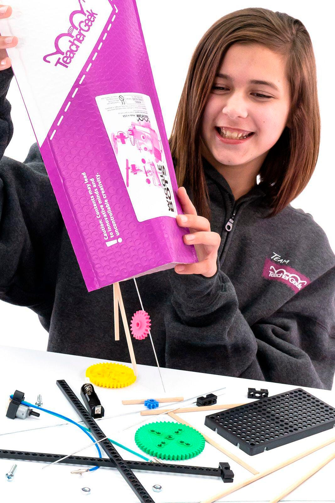 TeacherGeek is not a toy; it’s better! Students love making real things, especially when they get to use age-appropriate tools. All that is needed is tape and a AA battery; a TeacherGeek Maker Tool Set is optional for even more creative designs!