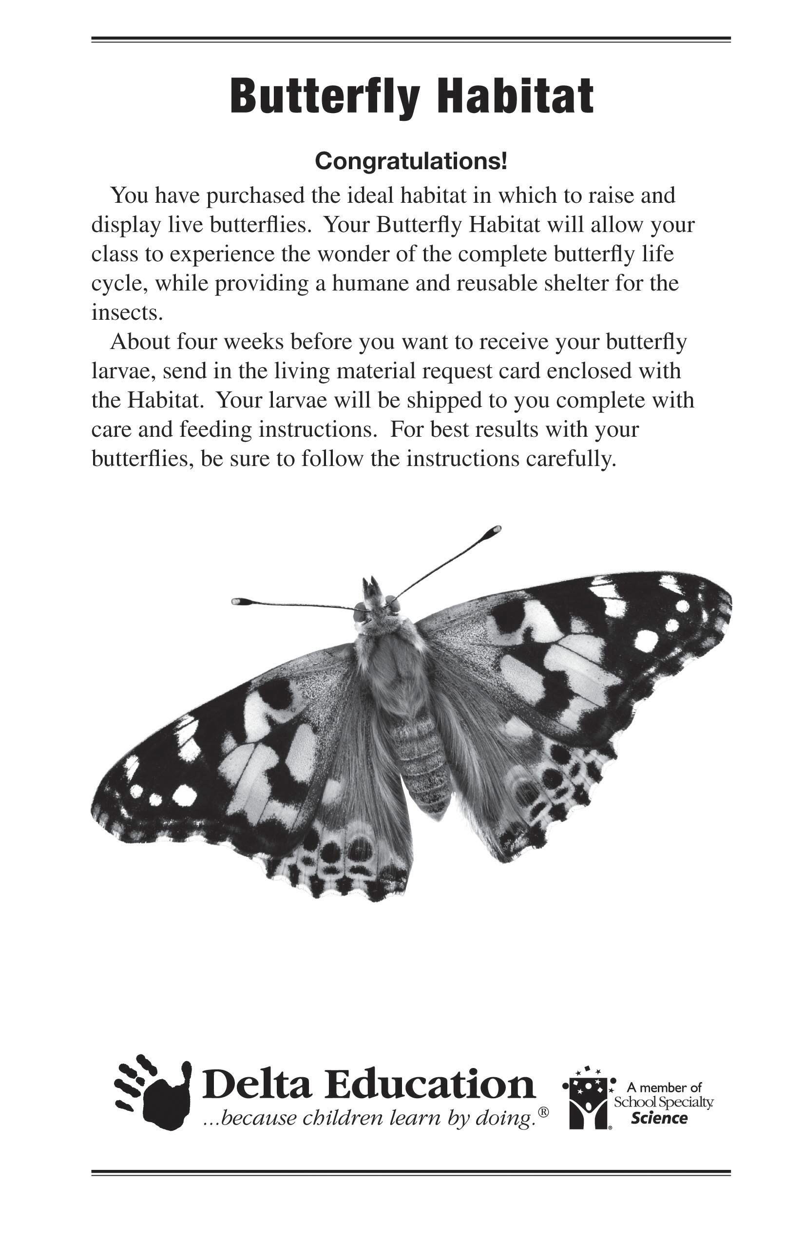 - 1 Delta Education Butterfly Habitat measuring 2 feet tall when expanded with a 15-inch diameter. Includes a Living Material Card Code that can be redeemed for 5 larvae plus a teacher's guide. Butterfly habitat features a pop-up cage with clear plastic top and a see-through netting that enables the students to see the life cycle of a butterfly through all stages