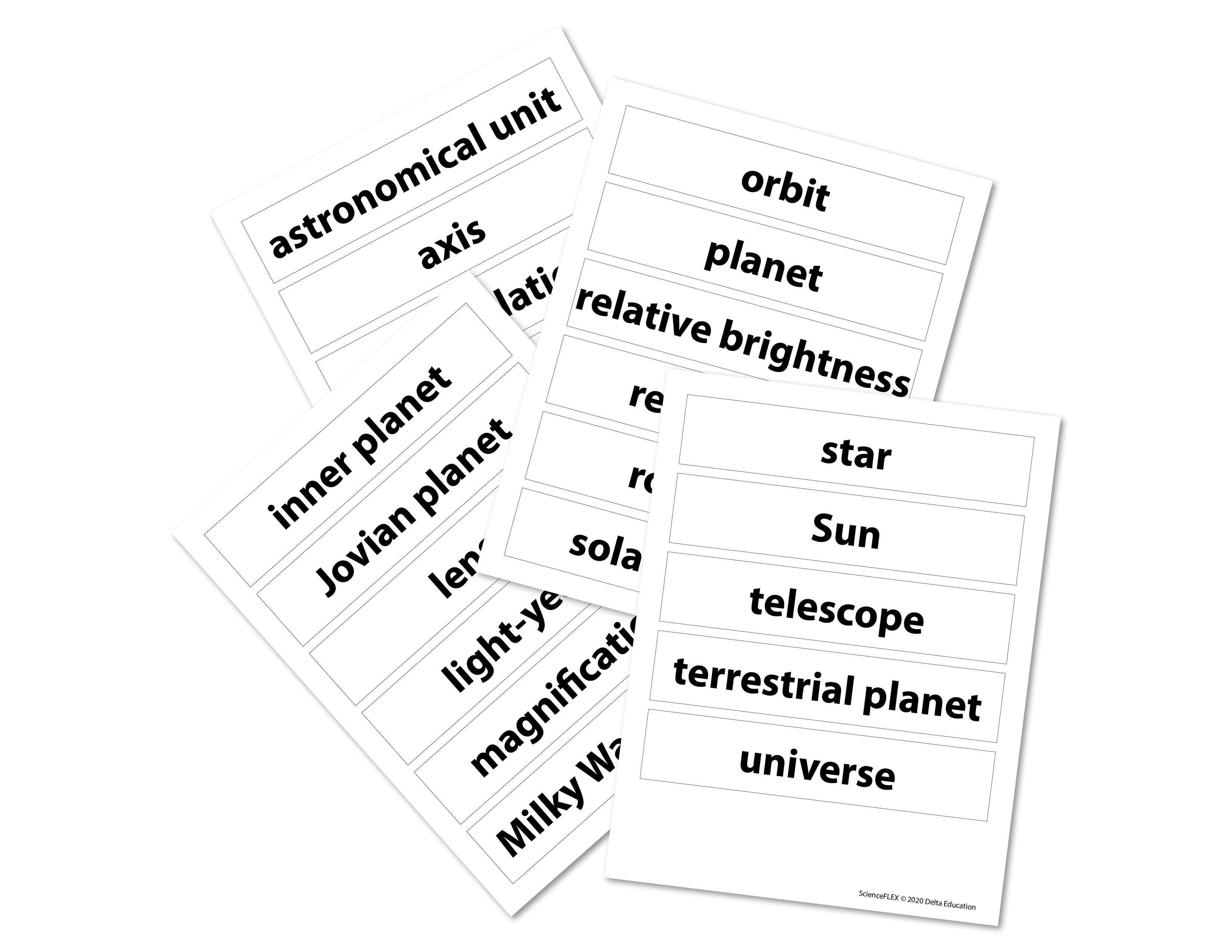 ScienceFLEX Word Wall Cards are a must-have aid for the ScienceFLEX Solar System and Beyond Module (sold separately). In this module, students take a “journey” through the solar system as they are guided through an exciting exploration of the planets and beyond wrapped up in 5E lessons where students investigate through active learning, then discover what we know about the solar system and beyond and how we know it. Designed for Grades 3 to 5.Features