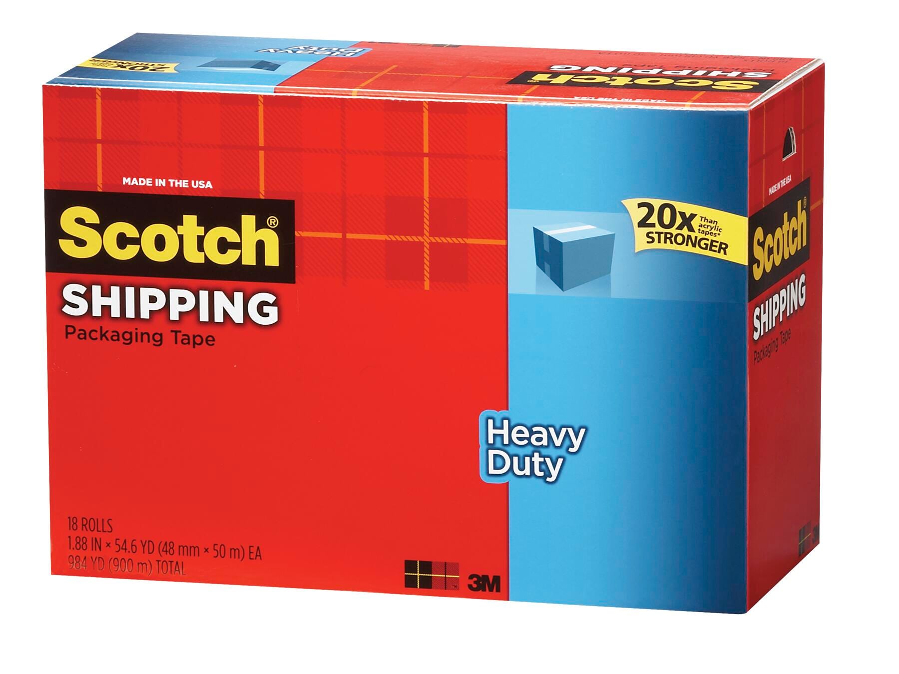 Scotch Heavy Duty Shipping Tape has a 3 inch core, measures 1.88 inches x 54.6 yards and 3.1 mil thick. Tensile strength of 47 pounds. Tape is 20X stronger than acrylic packaging tape is resistant to splitting, bursting and moisture. Clear. Pack of 18.