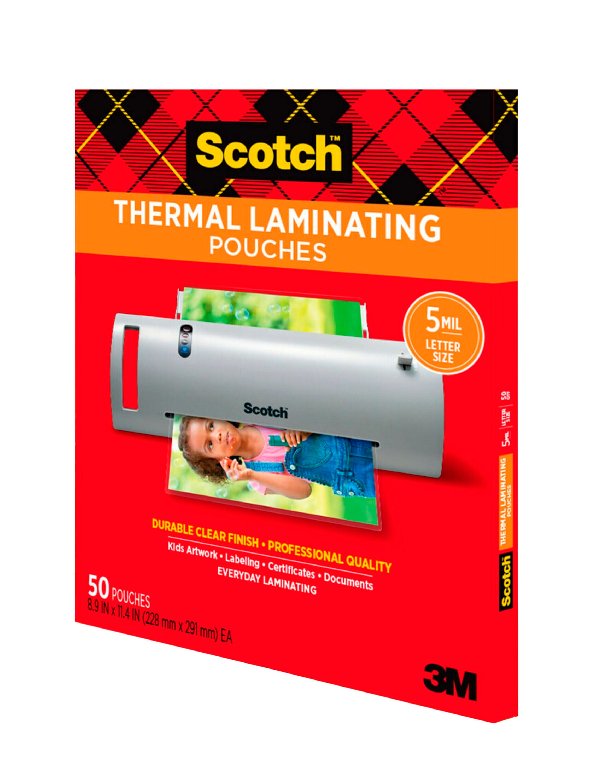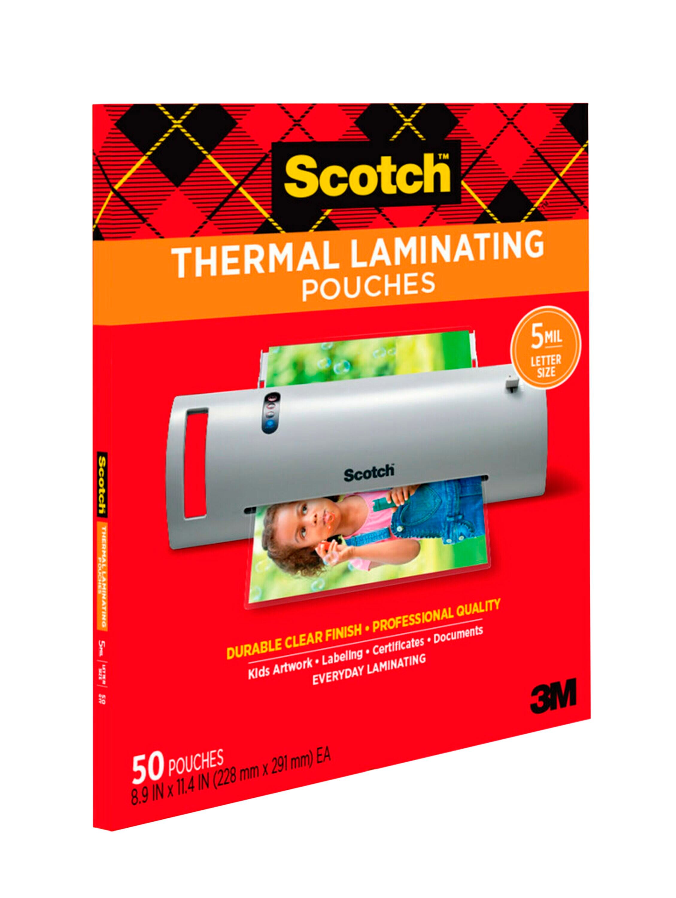 Scotch Thermal Laminating Letter Size Pouches measure 9 x 11-1/2 inches to protect 8-1/2 x 11 inch documents. Clear laminate is 5 mil thick. Pack of 50.Features