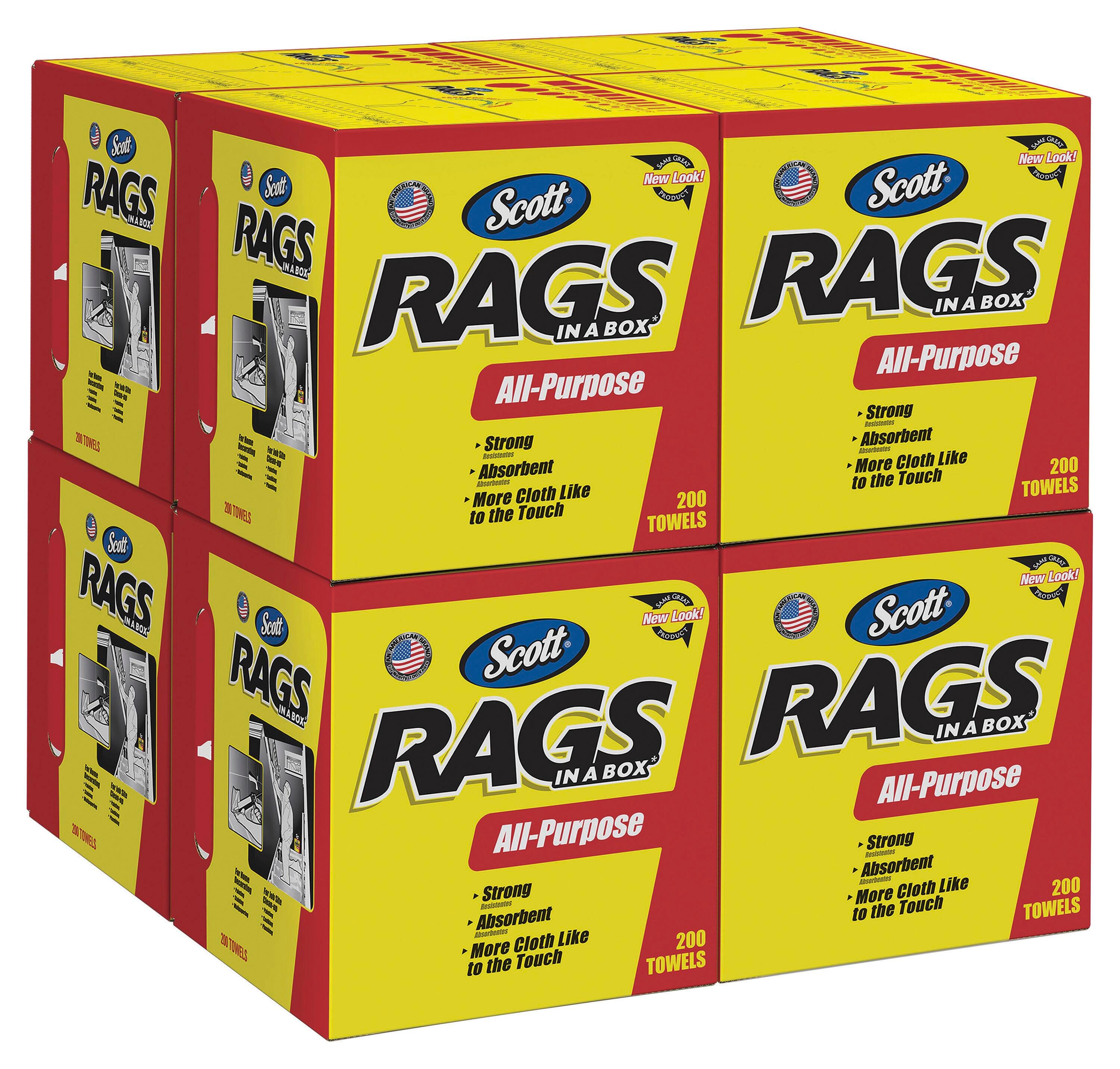 Scott Rags in a Box are ideal for painting, wiping up spills, staining, and refinishing furniture. Soft, absorbent towels perform like a sponge. Pop-up box with built-in handle allows users to take the multipurpose rags to the job while keeping rags clean. 200 towels per box: Carton of 8. White.