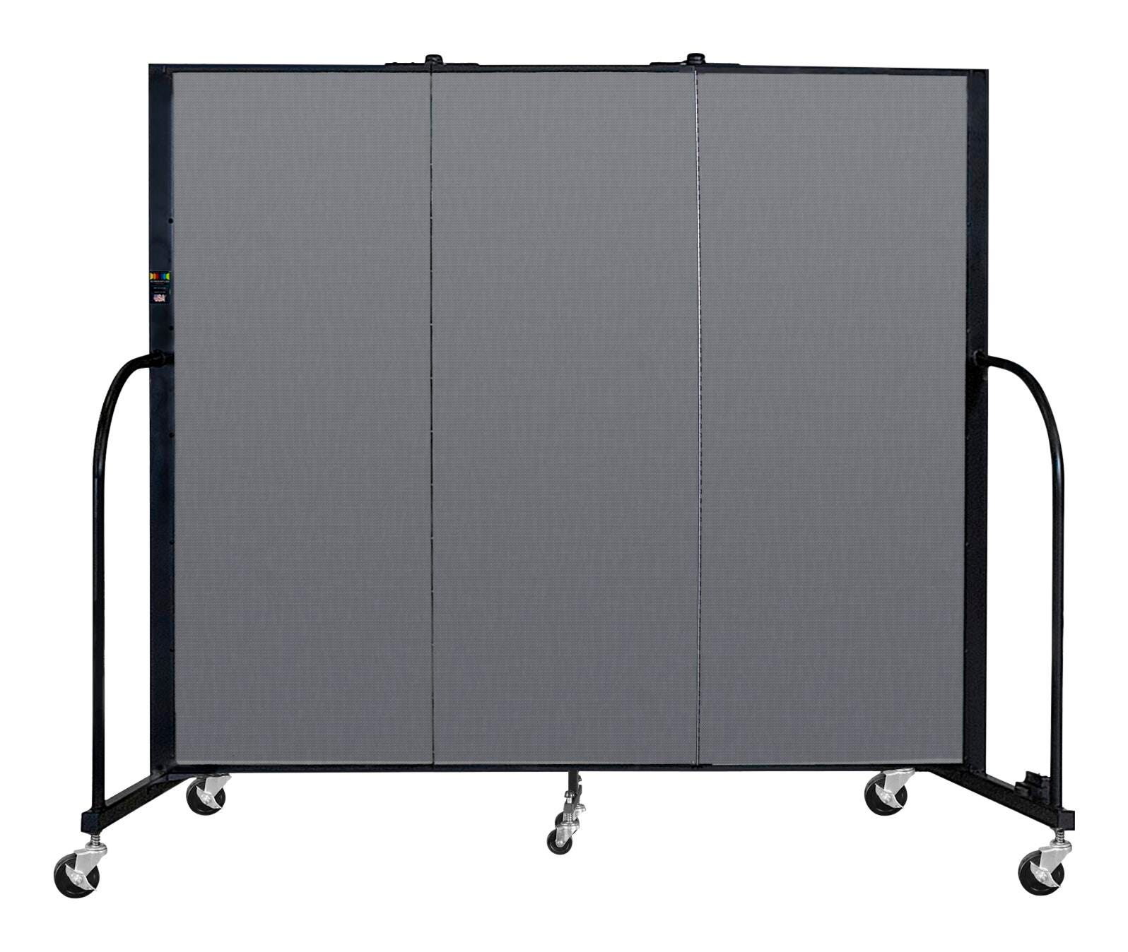 Features 3 hinged panels for dividing rooms to create additional teaching areas. Free standing partition does not require complex track systems or costly structural supports; does not intervene with heat, light or ventilation systems. Use to form continuous dividers of any length using connecting units, sold separately. Features sound absorbing panels with self levelling, non-marking casters for easy mobility. Includes full length position control hinges made from anodized aluminum and can be used straight, curved or in angles. Perfect for art displays, science fairs, school plays, hiding construction projects, before and after school programs, and creating classrooms wherever needed! Folds easily for storage. Measures 5 feet 9 inches W x 7 feet 4 inches high.