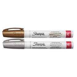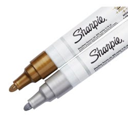 Sharpie Oil-Based Paint Markers help you create colorfully painted rocks, inspired scrapbooks, and fun window designs in vivid metallic colors. Each paint pen contains quick-drying paint that finishes with an opaque metallic sheen designed to stand out on light and dark surfaces, making these a perfect tool for arts and crafts projects or the job site. The glistening paint resists fading, water, and abrasions, but is removable from glass so your marks last. The medium point creates clear and bold lines that bring any idea to life. This set of two contains markers in gold and silver.Features