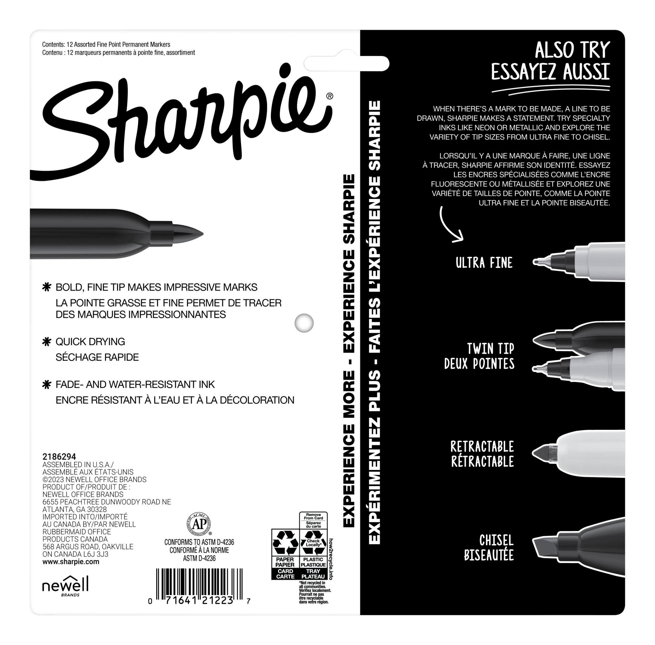 These Sharpie Fine Point Permanent Markers deliver the iconic quick-drying, permanent ink that resists water and fading in an assortment of ultra-bright and exciting colors. The fine points create bold lines and fine details and are hardwearing to withstand regular use. Produce clear, strong, and permanent marks on most common and hard-to-mark surfaces including metal, glass, plastic, foil, cloth, rubber, waxed paper, and more. This pack of 12 permanent markers contains an assortment of vibrant Glam Pop colors.Features