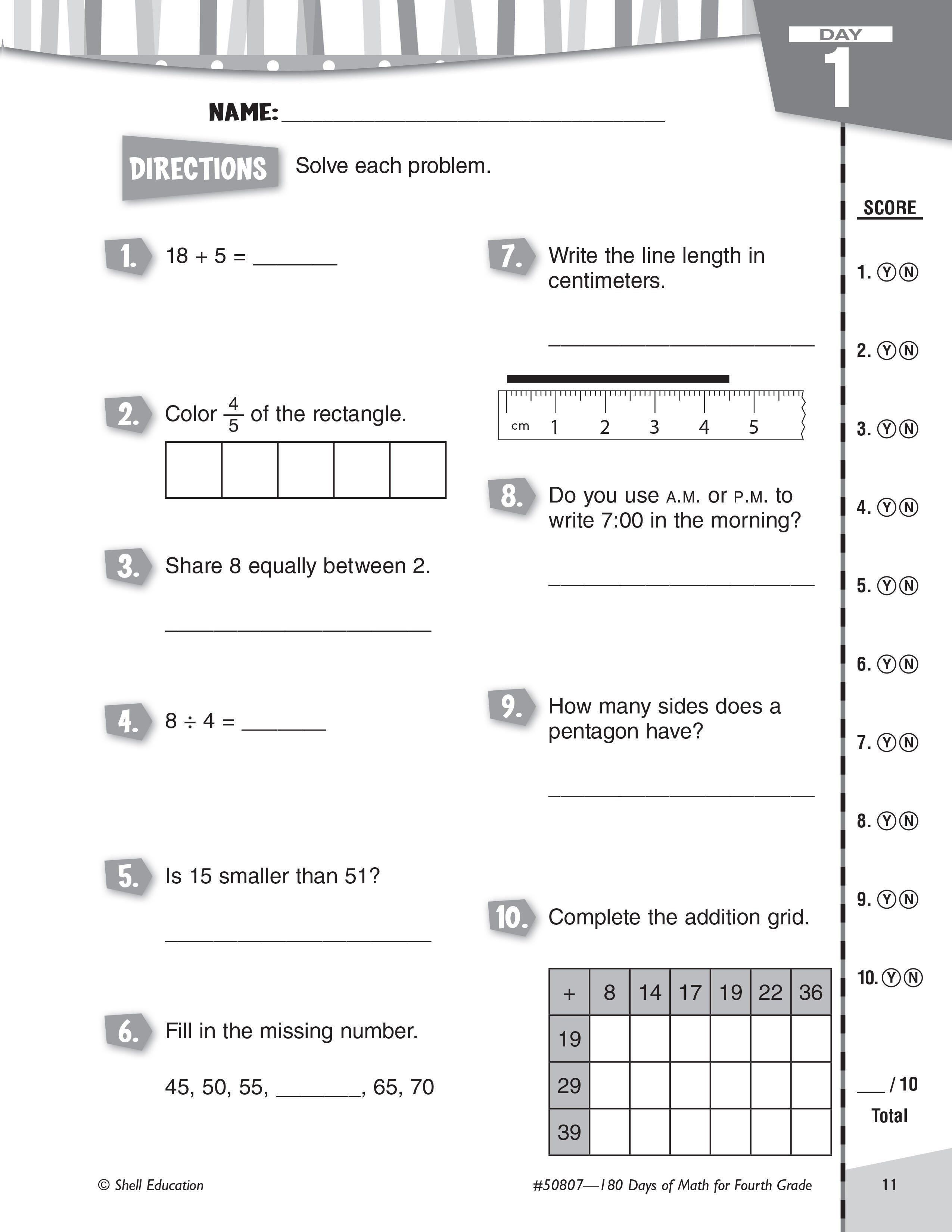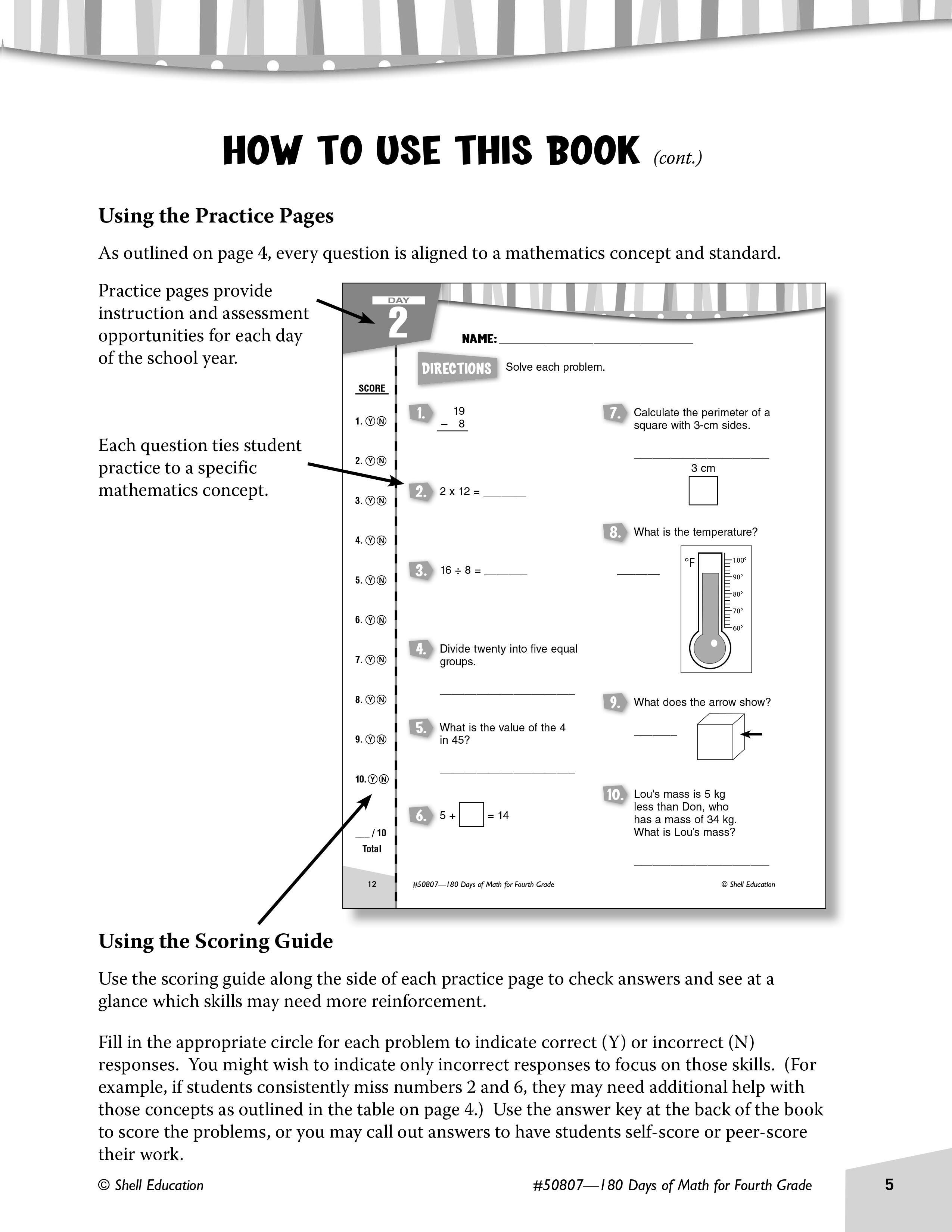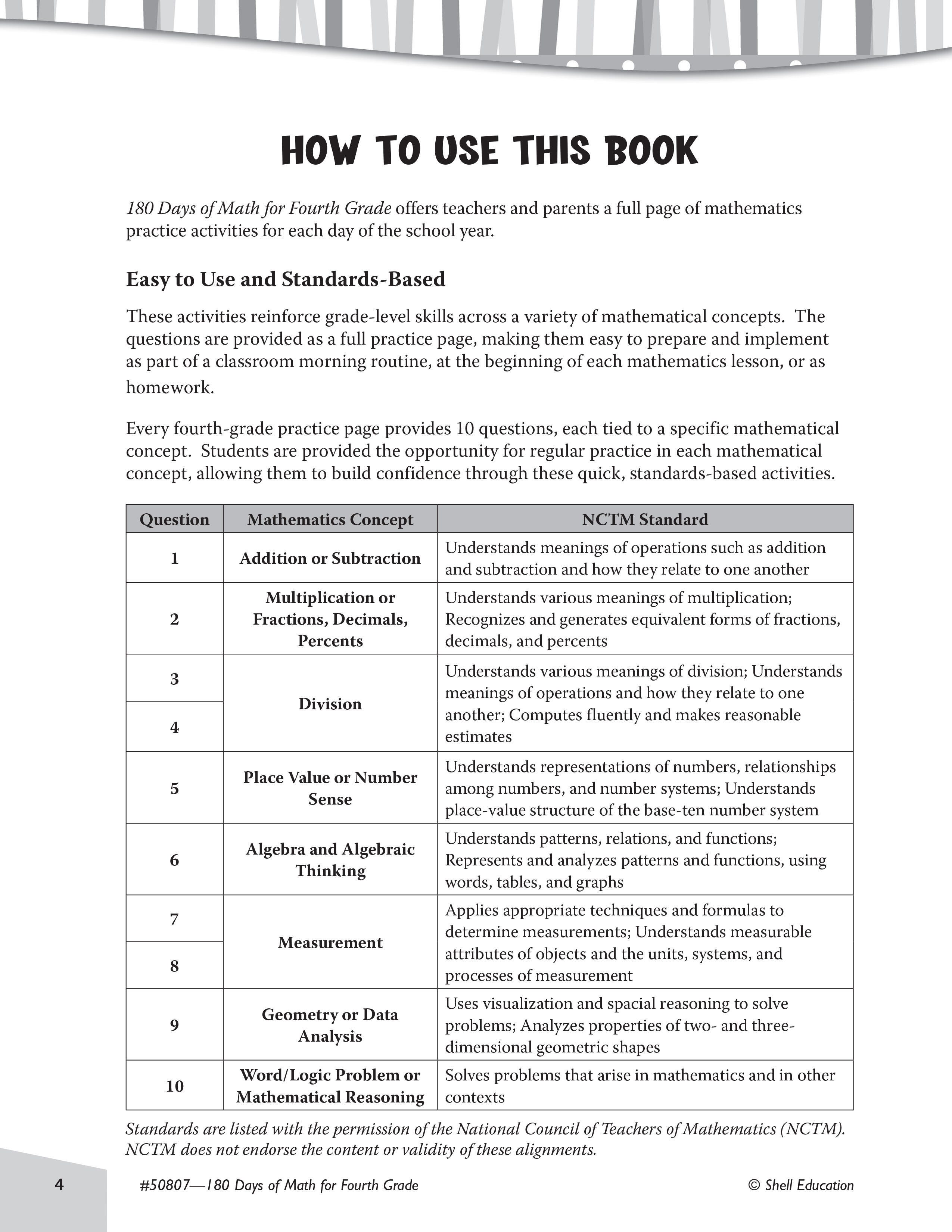 180 Days of Math is an effective workbook designed to help students improve their math skills. This easy-to-use fourth grade workbook is great for at-home learning or in the classroom. The engaging standards-based activities cover grade-level skills with easy to follow instructions and an answer key to quickly assess student understanding. Each daily practice page includes 10 math problems covering algebraic thinking, fractions, multiplication, division, measurement and data, and geometry. Watch as student’s math confidence grows with these quick independent learning activities.Parents appreciate the teacher-approved activity books that keep their child engaged and learning. Great for homeschooling, to reinforce learning at school, or prevent learning loss over summer.Teachers rely on the daily practice workbooks to save them valuable time. The ready to implement activities are perfect for daily morning review or homework. The activities can also be used for intervention skill building to address learning gaps.Features