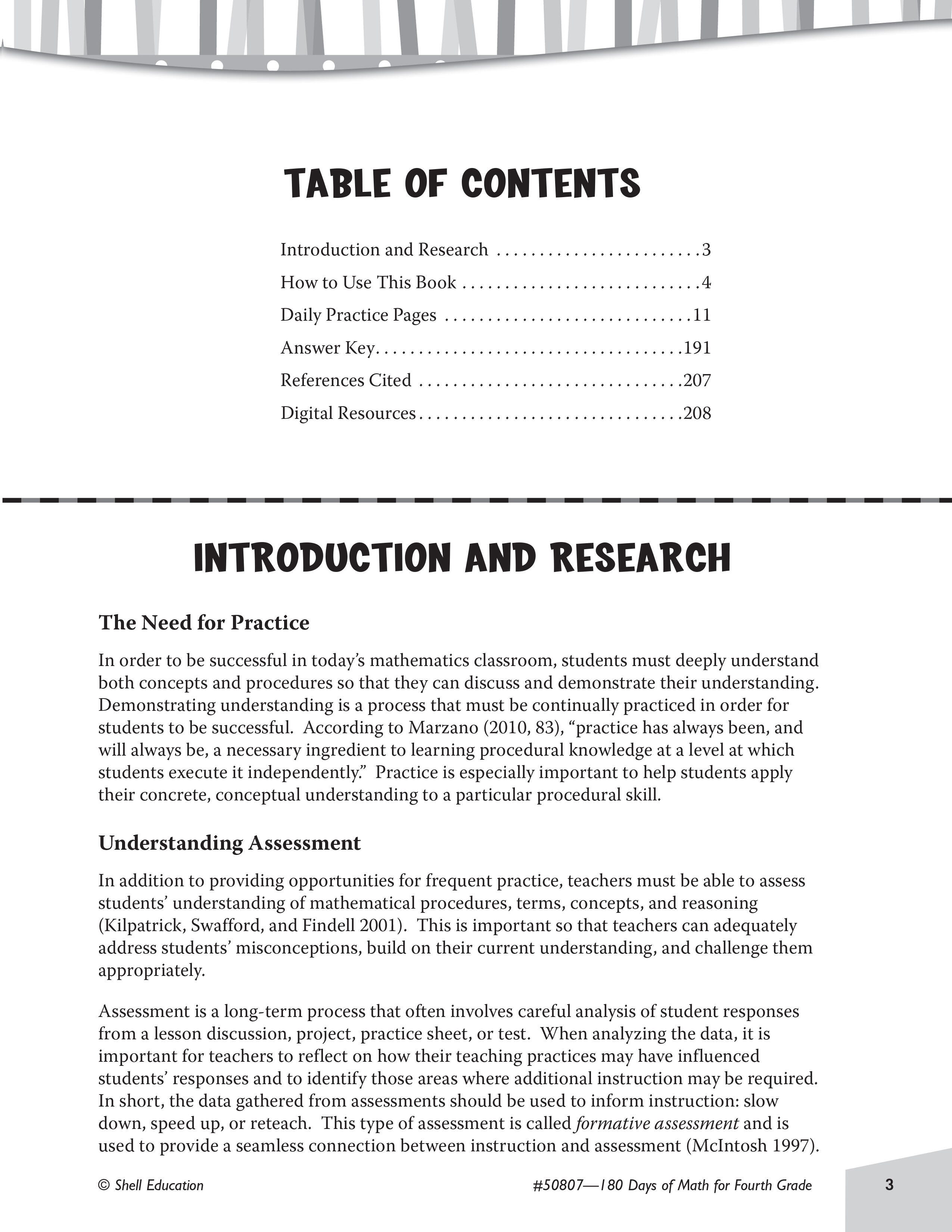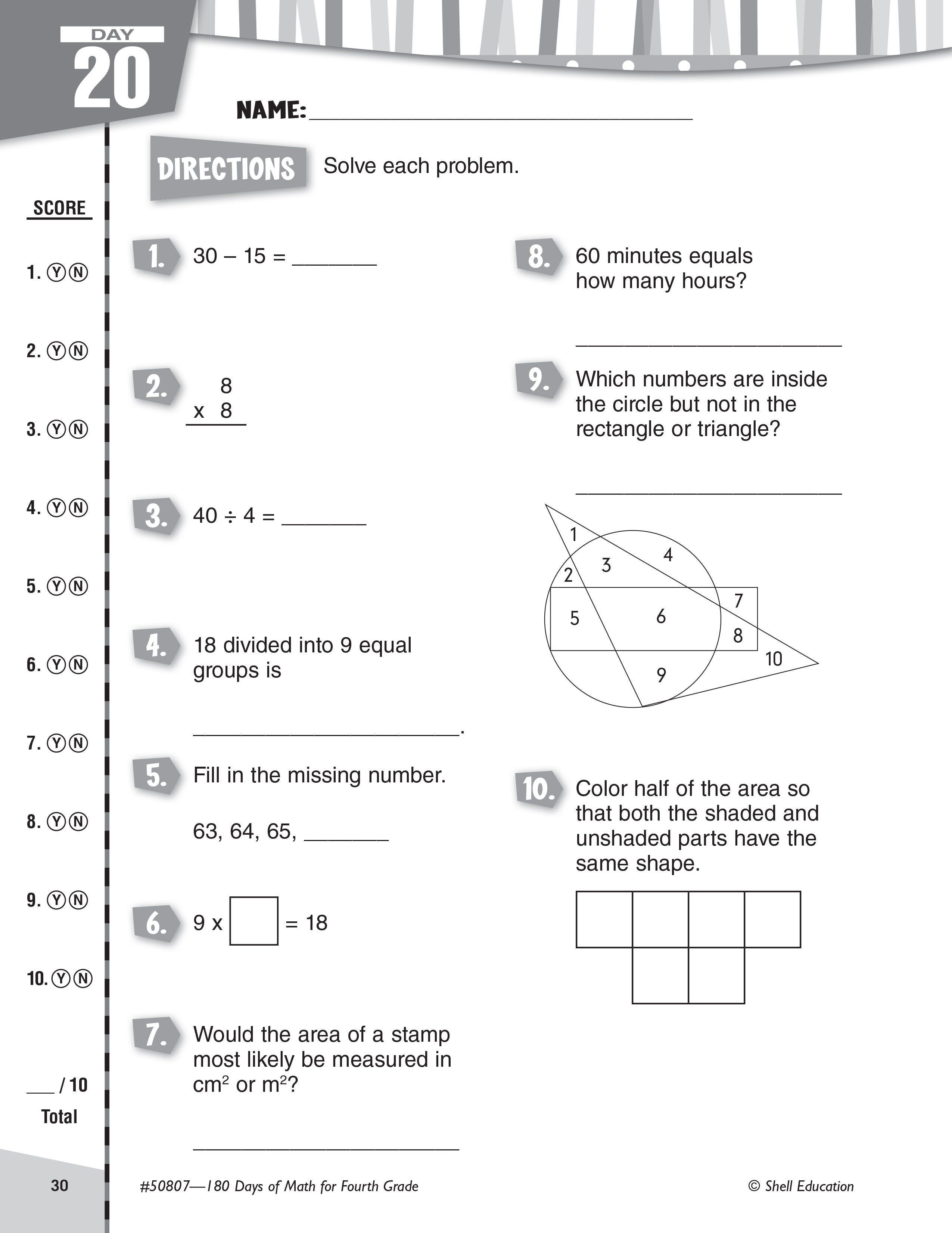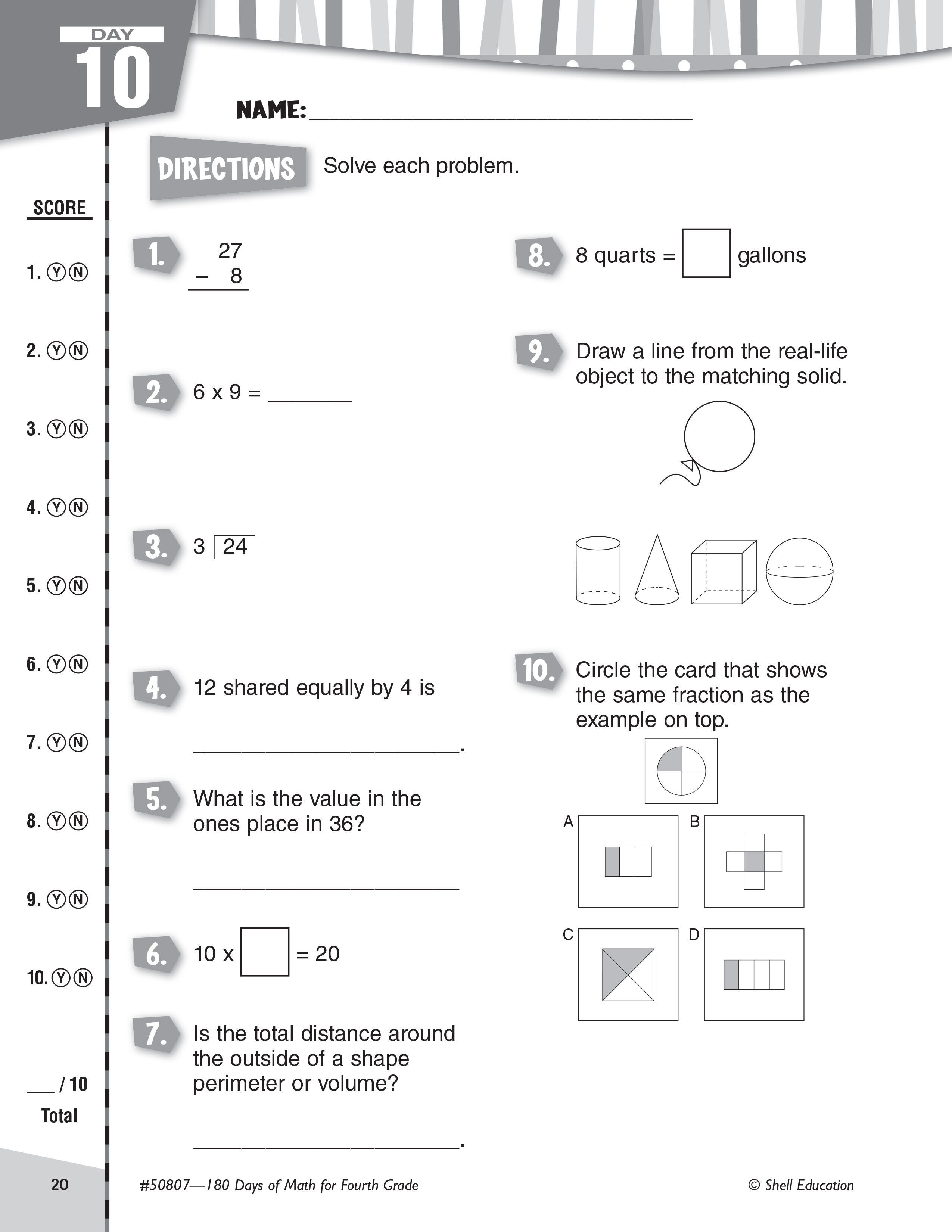 180 Days of Math is an effective workbook designed to help students improve their math skills. This easy-to-use fourth grade workbook is great for at-home learning or in the classroom. The engaging standards-based activities cover grade-level skills with easy to follow instructions and an answer key to quickly assess student understanding. Each daily practice page includes 10 math problems covering algebraic thinking, fractions, multiplication, division, measurement and data, and geometry. Watch as student’s math confidence grows with these quick independent learning activities.Parents appreciate the teacher-approved activity books that keep their child engaged and learning. Great for homeschooling, to reinforce learning at school, or prevent learning loss over summer.Teachers rely on the daily practice workbooks to save them valuable time. The ready to implement activities are perfect for daily morning review or homework. The activities can also be used for intervention skill building to address learning gaps.Features