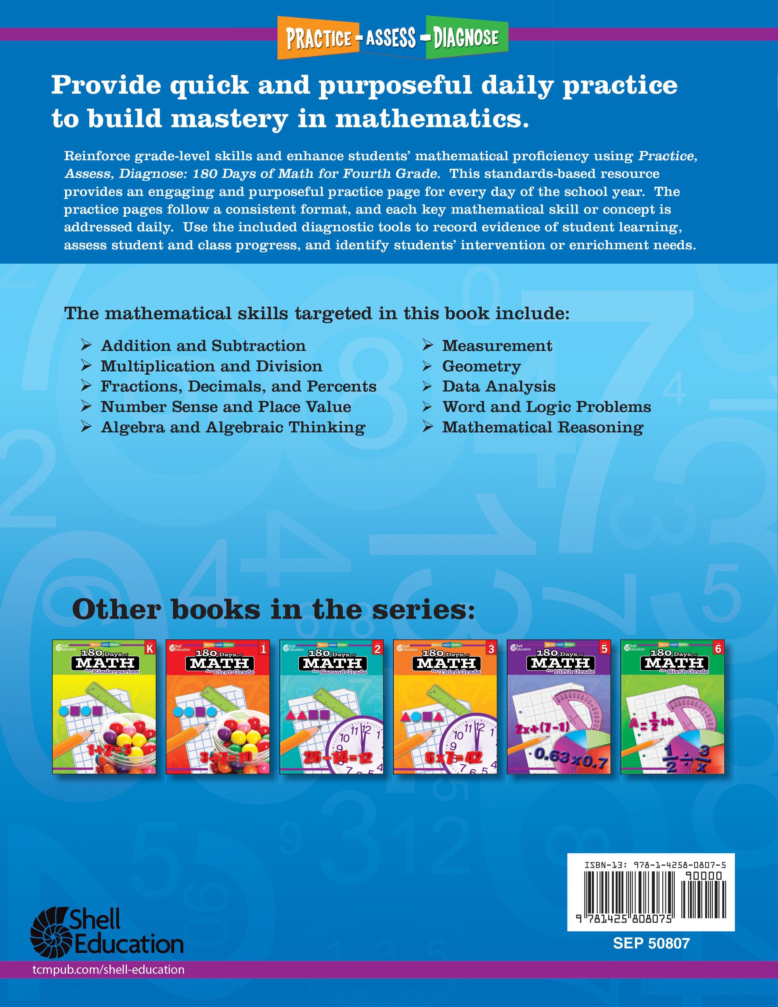 Practice, Assess, Diagnose: 180 Days of Math provides 4th grade teachers and parents with 180 daily practice activities to build and gauge students' mathematical fluency.