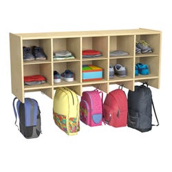 The Childcraft® 10-Cubby Wall Coat Locker offers a smart and space-saving solution for storing coats, bags, lunches, and more. Designed to be mounted at any height, these classroom cubbies are ideal for students of all ages. The cubby locker features 10 individual cubbies and aluminum hooks to keep personal belongings organized and within reach. The compact design is perfect for classrooms, childcare centers, and entryways, helping to maintain clean and clutter-free spaces. Measures 47-3/4 W x 14-1/4 D x 19-3/4 H inches; holds bins or baskets measuring 7-3/4 W x 12 D x 5-1/4 H inches (sold separately). Comes fully assembled.Features