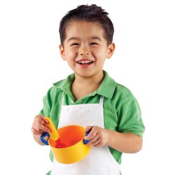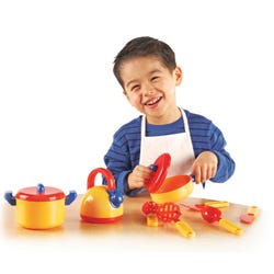 Steam, boil, and stir up the kitchen play fun with this Pretend & Play Cooking Set from Learning Resources. Bright color blocked, plastic 10-piece cookware set includes tea kettle, frying pan with lid (5 inches), two-handled pot with lid, and 5 assorted utensils with large, easy-to-grip handles. Kids can use this set for cooking up some imaginative role play fun or adults can use to teach their little ones the differences and uses between each piece. Set for ages 3 and up.Features