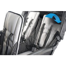 The Quad Sport Stroller is constructed of durable tubing that is lightweight and easy to maneuver. Front seats recline from 0 to 25 degrees, and rear seats recline from 25 to 60 degrees. Stroller has 6-1/2 inch leg room from the front edge of the second-row seat to the back of the first row. Each seat can withstand 40 pounds. The rear storage area offers space for babies' necessities and a foot-activated brake for securing the stroller when parked. Stroller fits through standard doorways so that children can be loaded indoors. When open stroller measures 53 L x 32-1/2 W x 46-1/2 H inches and when folded measures 41 L x 32-1/2 W x 22 H inches.