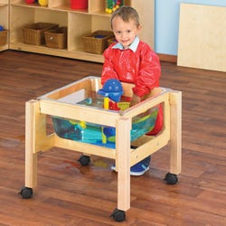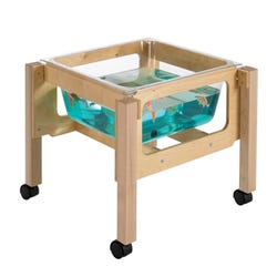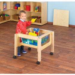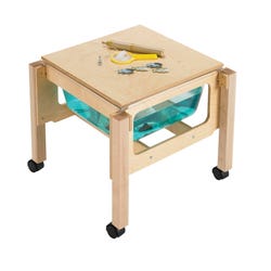 The Childcraft® Toddler Sand and Water Table provides endless opportunities for sensory play and STEM exploration. Perfect for classrooms, childcare centers, and home learning spaces, this small activity table features a sturdy birch plywood frame with a 4-coat UV acrylic finish for lasting durability. The included tub can be filled with sand, water, or other sensory materials to support hands-on discovery, fine motor development, and early science concepts. Equipped with smooth-rolling casters that lock for stability, this mobile sensory table is easy to move and secure in place. A top cover allows for multiple uses. Measures 23-1/4 W x 23-1/4 D x 21 H inches.Features
