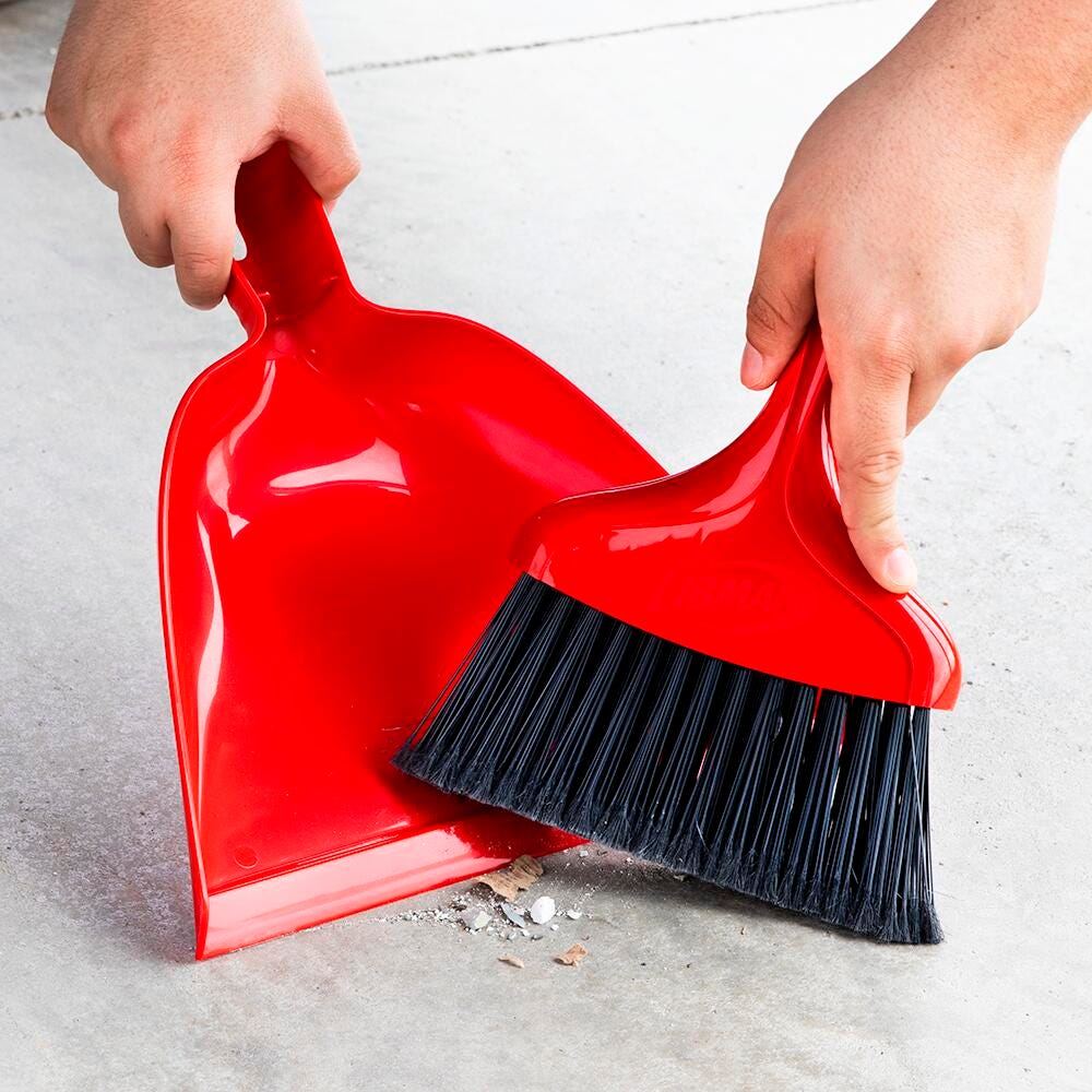 The Libman Dust Pan with Whisk Broom Set (Red with black fibers) includes a 10 inch wide dust pan and a whisk broom that easily snaps into and stores inside the pan.Features