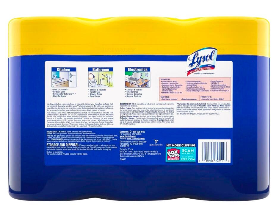 Wipes are thick, pre-moistened wipes that kill 99.9% of viruses and bacteria on hard, nonporous surfaces and is effective against 46 microorganisms. Removes 95% of allergens. Ideal for cleaning, disinfecting, and deodorizing. Use on kitchen counters, appliances, stove tops, cabinets, floors, garbage cans, toilet exteriors, bathtubs, and sinks. EPA Registered.Features
