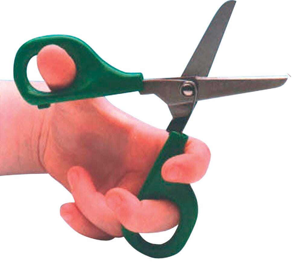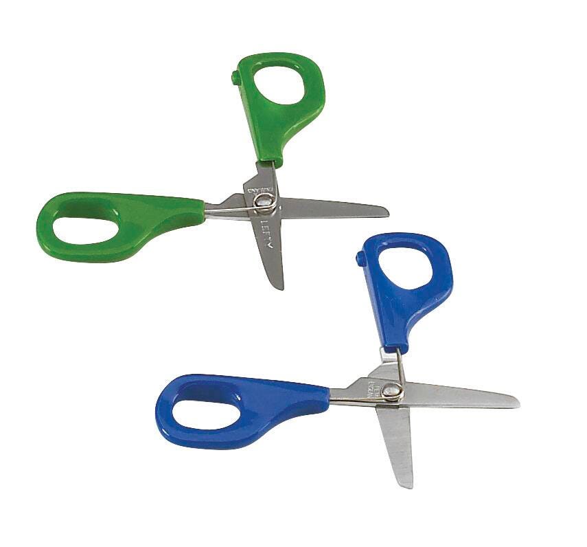 PETA Self-Opening scissors are conventional style scissors with a hidden spring that will force the blades back to an open position after the grip has been eased. Ideal for children with special needs in a mainstream environment, or for older children who prefer a more conventional styling but are unable to manage opening and closing the blades. High quality blunt tip stainless steel blades provide longevity and cut through paper with ease, and the included blade guard fixes over the blades for safe storage. Green handle specifies left-handed design.