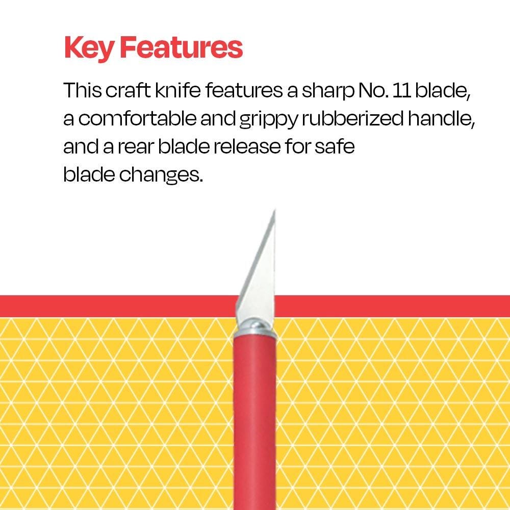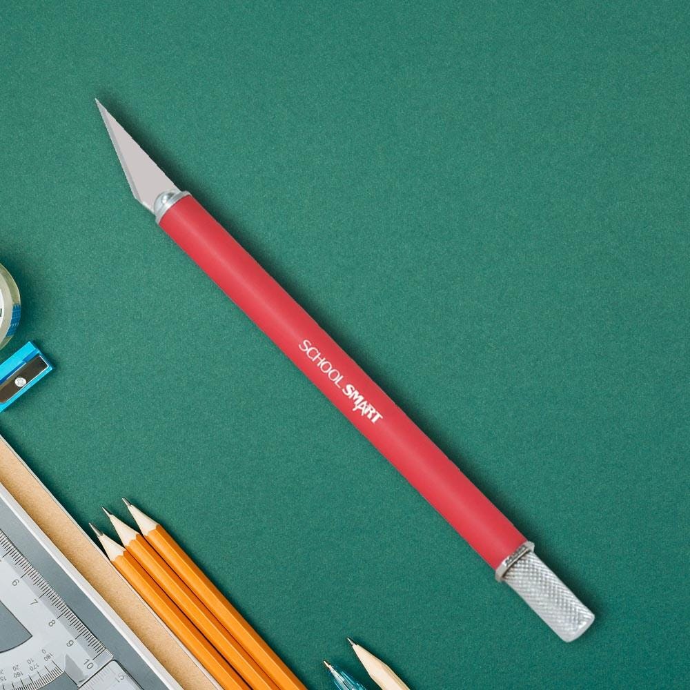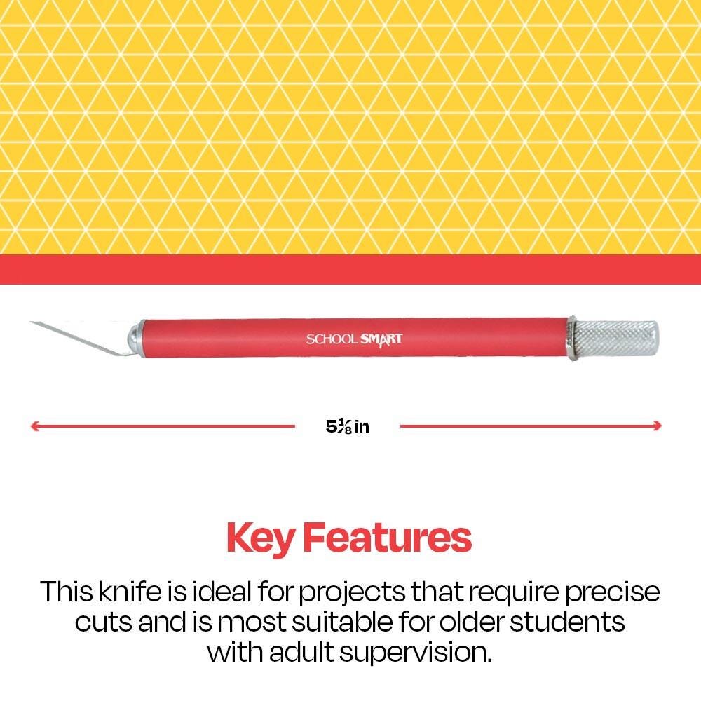 Focus on the details in your artwork with the comfortable-to-hold School Smart Artist Knife. This arts and crafts knife includes a safety cap and a No. 11 blade packed in a tube. The crafting knife has a rubberized grip for better control and greater comfort, a plus rear blade release for safe, fast blade changes. An octagonal nut on the back of the handle keeps it from rolling. The knife measures 5-1/8 inches long.