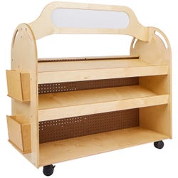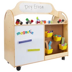 The Childcraft® Mobile Makerspace Cart is the perfect solution for storing and transporting all your classroom materials for hands-on learning. Featuring multiple compartments, shelves, and a pegboard back panel for hanging tools, this storage cart keeps everything organized in one place. Two tilted top shelves provide easy access to bins, while side slots hold worksheets, folders, or papers. The built-in magnetic whiteboard and additional top signboard allow for step-by-step instructions, logic games, diagrams, and more. Four smooth-rolling casters ensure effortless mobility, making it easy to move the rolling cart between classrooms or learning stations. Measures 48-1/4 W x 22-1/2 D x 49 H inches. Comes fully assembled.Features