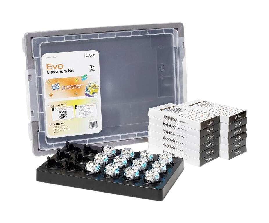 This Evo Educational Coding Robot Classroom kit from Ozobot delivers everything you need to make coding and robotics education simple. The kit comes with 12 Evo robots, accessories, and 1 Ozobot Classroom license. Students from grades K through 12 can code their Evo robots using the Color Code markers for screen-free programming, or by going online to use OzoBlockly visual programming or Python. Ozobot Classroom software unlocks teacher training, lesson library access, and real-time information about student engagement for both online and offline student activity. This kit provides an all-in-one solution that allows students to learn coding and robotics in a scalable, fun, and engaging way.
