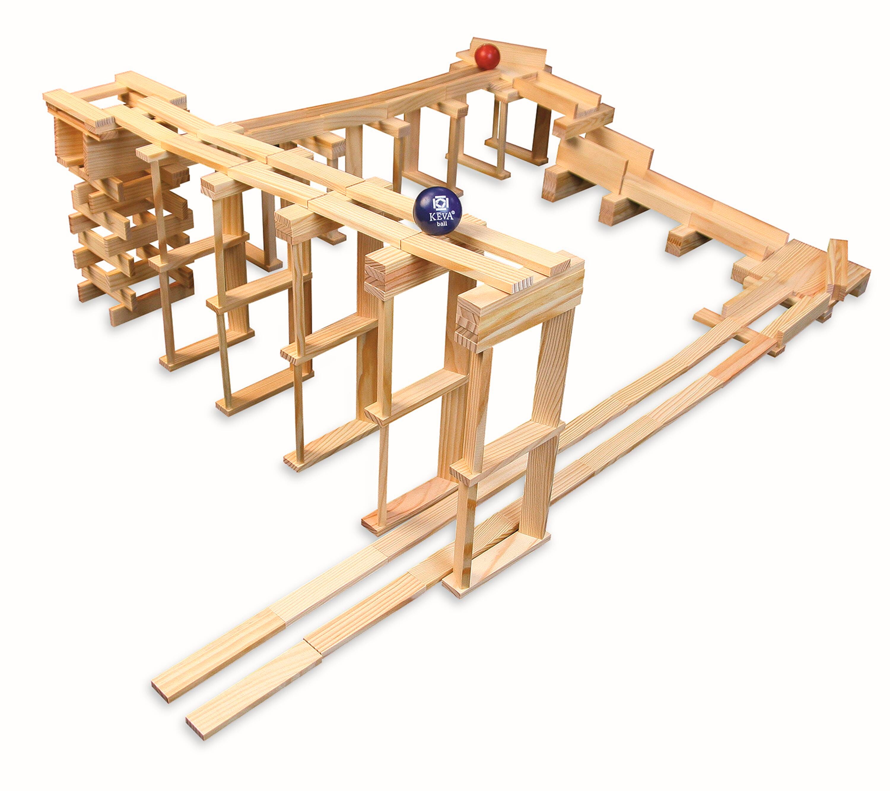 Take hands-on learning to the next level with KEVA Contraptions! Create intricate tunnels, towers, ramps and chutes with this interactive STEM tool! No glue, no connectors, just simple stacking and the laws of gravity. Each Contraptions construction set comes with 200 high-precision KEVA planks and two specially designed bouncy balls that are lightweight for maximum action! As you build, learn the principals of slope, velocity, force, momentum and balance. The "bounce" of the ball provides some of the most surprising moves-make it twist, bump, hop and stop. Projects vary in difficultly, making it suitable for a wide range of ages and abilities. KEVA Contraptions is an inspiration to future engineers, architects and designers and provides an amazing array of creative possibility. Includes a guide book.