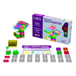 Colorful building blocks contain electronic components such as a battery module, LEDs, geared motor and gear. Build whatever structures come to your imagination that rotate, flash and change colors!Features
