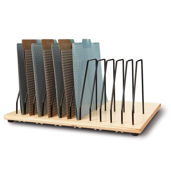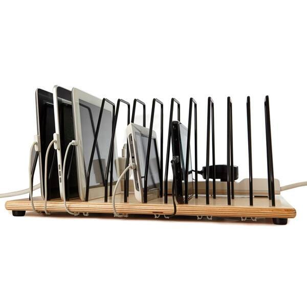 Organize your area and conveniently store 12 tablets or other learning devices. Space in back allows you to mount your own power strip or other syncing components (not included). Comes with non-slip feet and handy cord management clips. Doubles as a portfolio stand or desk organizer. Dividers can be easily removed. Tablets and power strips not included. Measures 17-1/2 W x 13-1/2 D x 8 H inches.