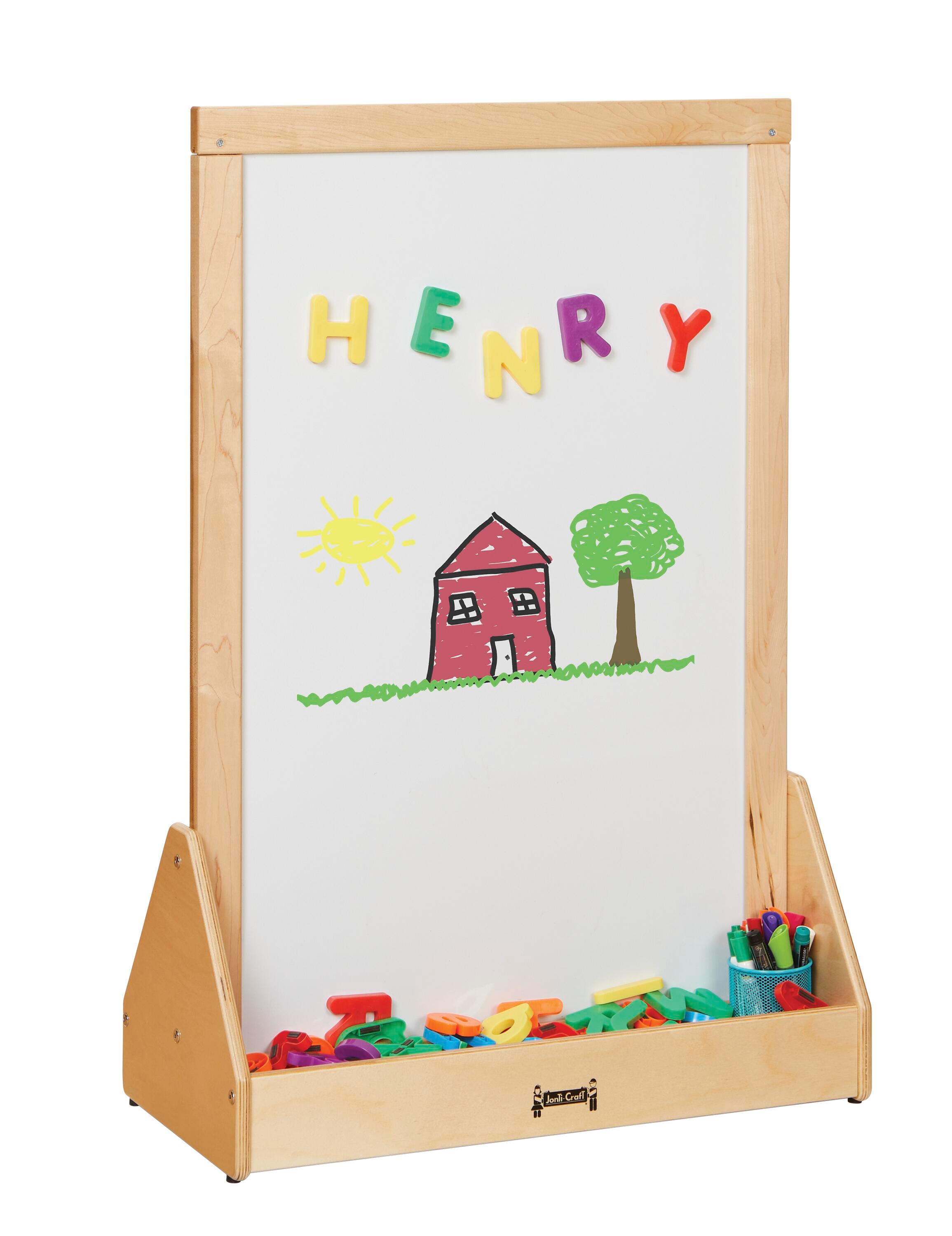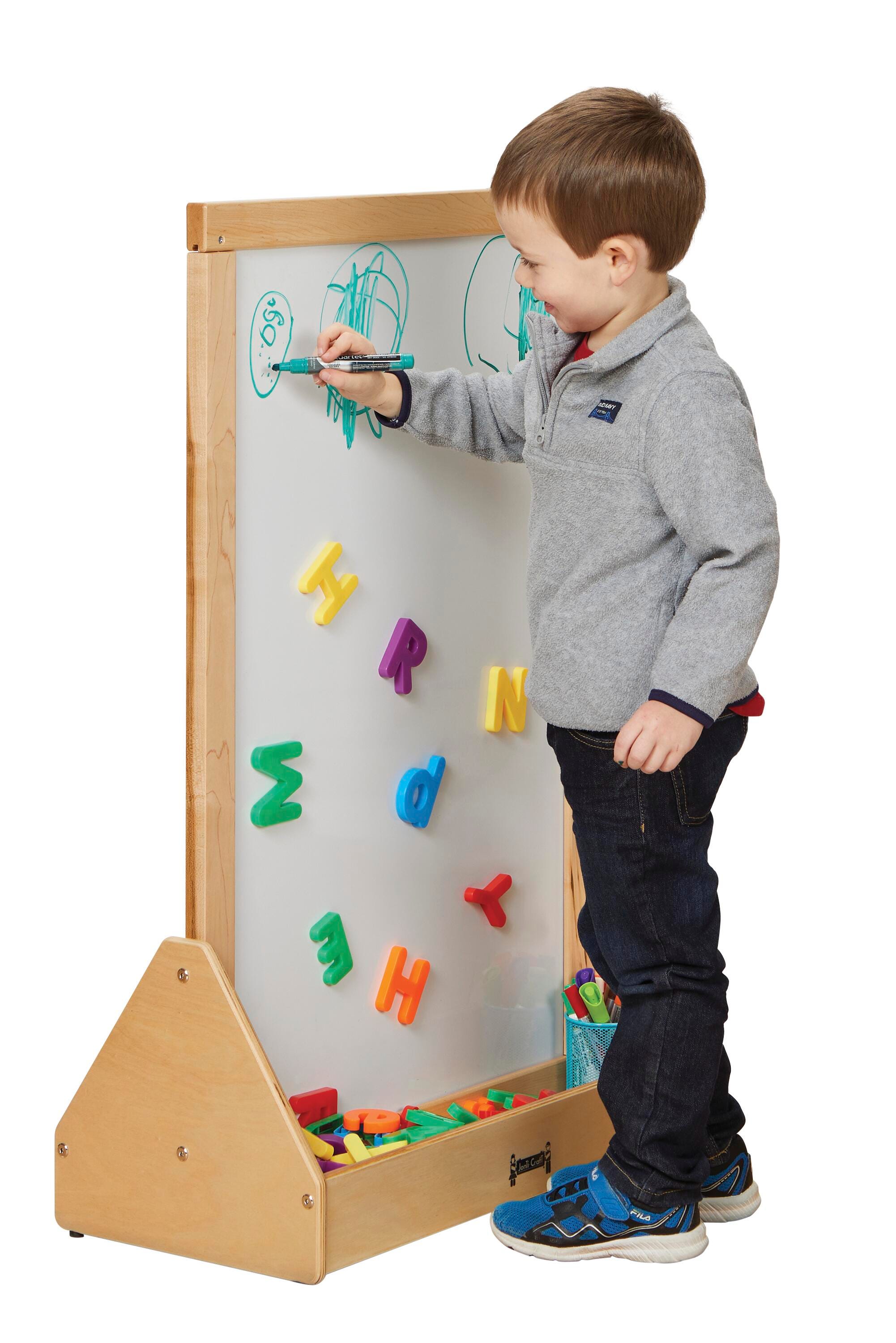 This standing board is the perfect height for children in Pre-K and features a double-sided Magnetic Write-n-Wipe panel for loads of creative fun! Children can spell out words with magnetic letters, draw their favorite pictures with dry-erase markers, or explore their favorite STEM and STEAM activities with magnetic gears, levels, and other learning aids (not included). At the bottom of the board, there is a handy tray for storing these supplies as well as catching any falling items during experiments. The Magnetic Write-n-Wipe Panel is 20-1/2 W x 31-3/4 H inches.Features