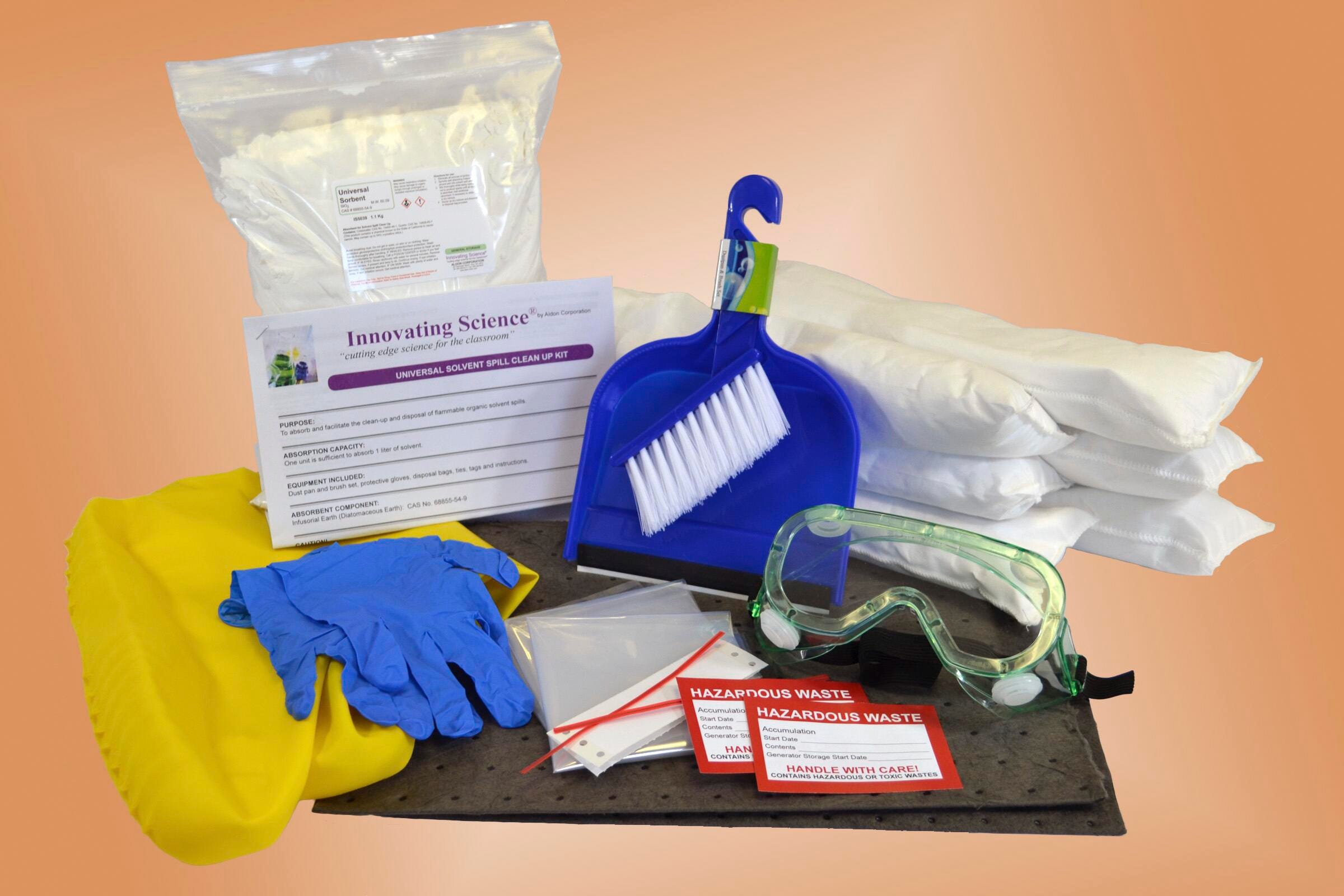 This universal absorbent eliminates the guesswork and is safe for use on all chemicals except hydrofluoric acid. This kit contains enough material to absorb 10 liters of solvent. Complete with instruction sheets and SDS.Kit Contains: 1.1 kg Universal Absorbent 1 pair Nitrile gloves 1 pair Latex boots 1 Splash resistant goggles 6 Lab pillows 4” x 14 “ x 1” 2 Absorbent pads 2 Poly bags 9 x 16 2 Twist ties 2 Blank tags