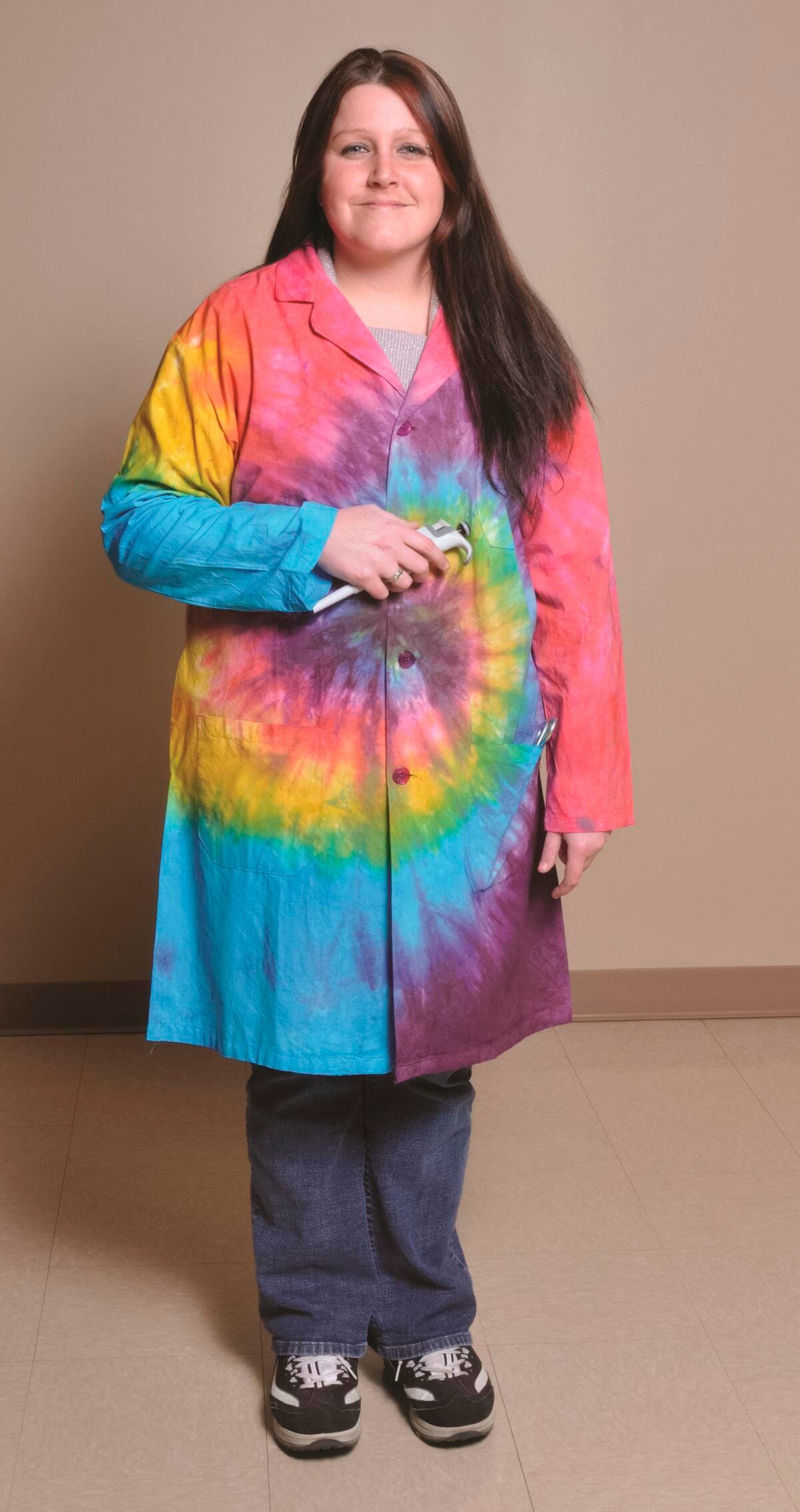 Knee-length lab coat made of easy-care 100% cotton with vibrant tie-dyed pattern. Features one upper left breast pocket, two roomy lower pockets, side pocket slit openings, and a sewn-down back belt.