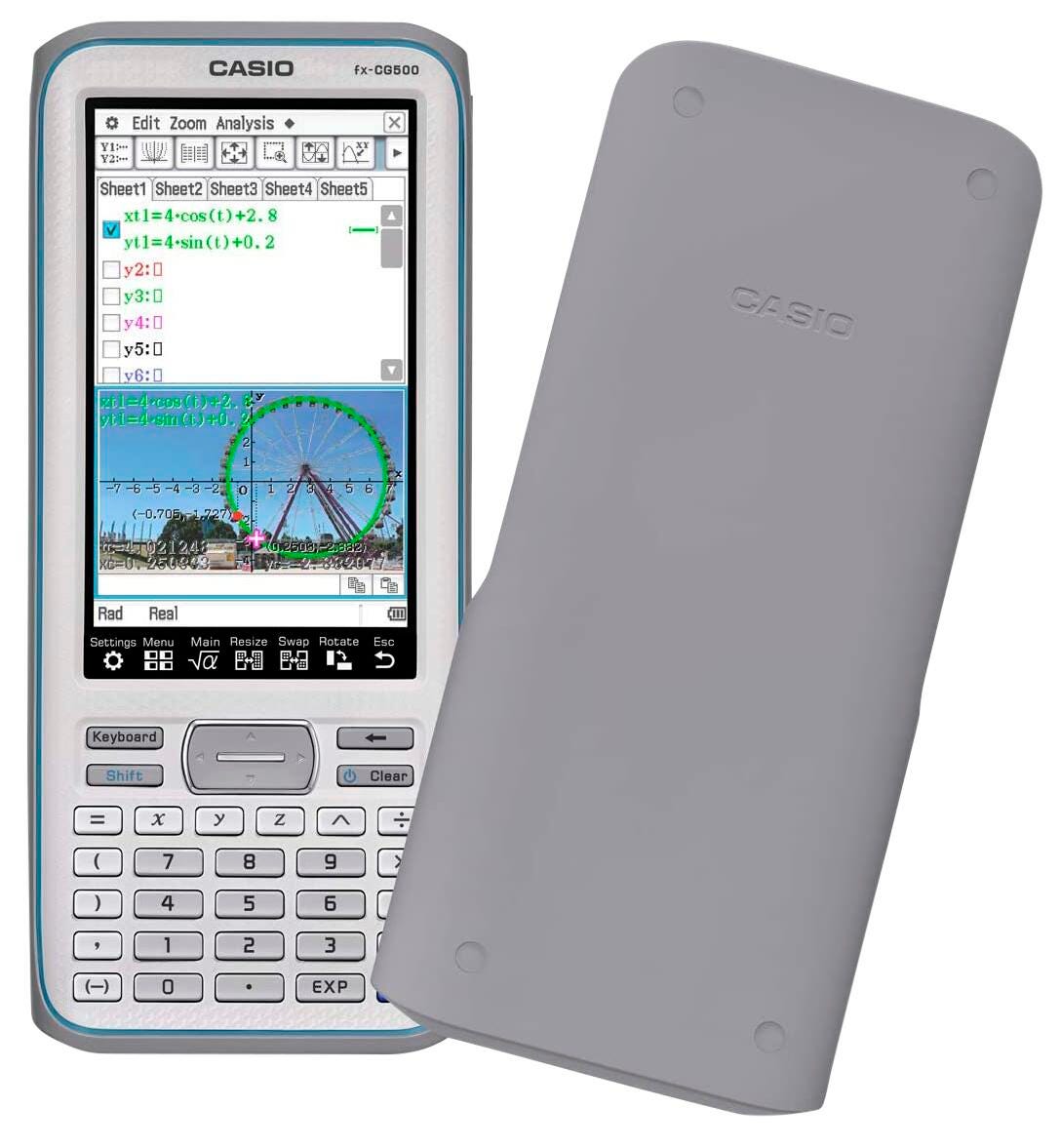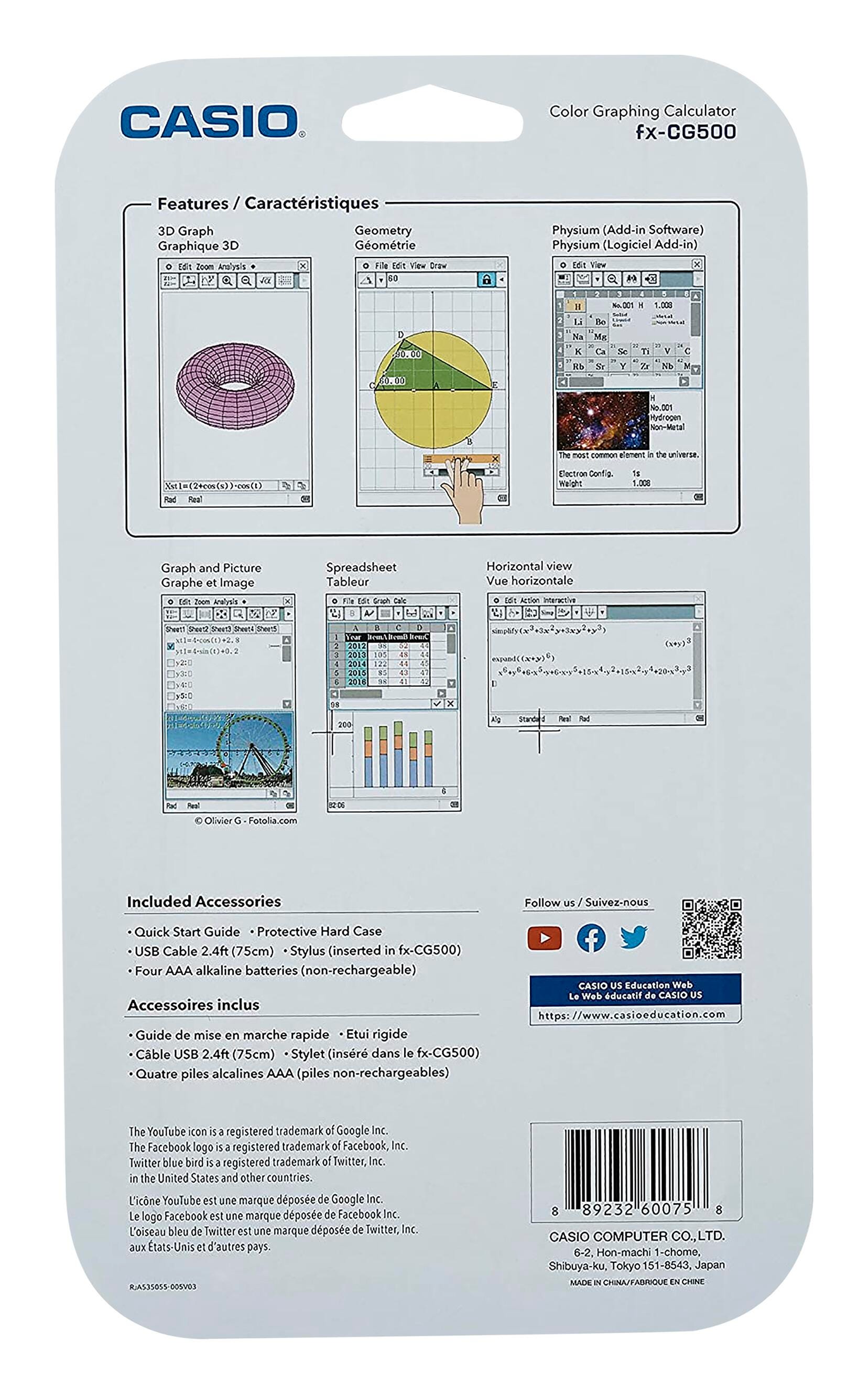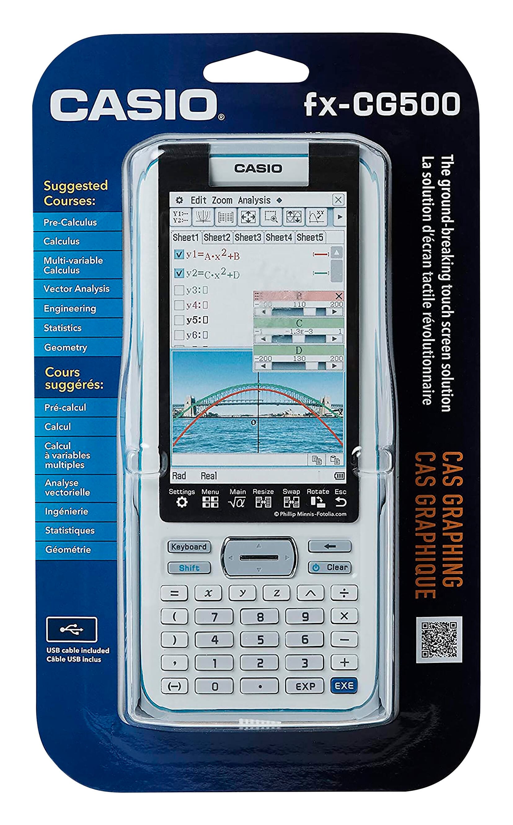 The FX-CG500LIH is a color graphing calculator with an extra large 4.8 inch LCD touchscreen textbook display and stylus. Drag and drop functionality enables students to quickly and intuitively pull information from one representation to another. Convenient drop down menus and handy soft keyboard makes this calculator very easy to use. Features advanced computer algebra system (CAS) for symbolic representation. Offers convenient USB connection for mass storage.