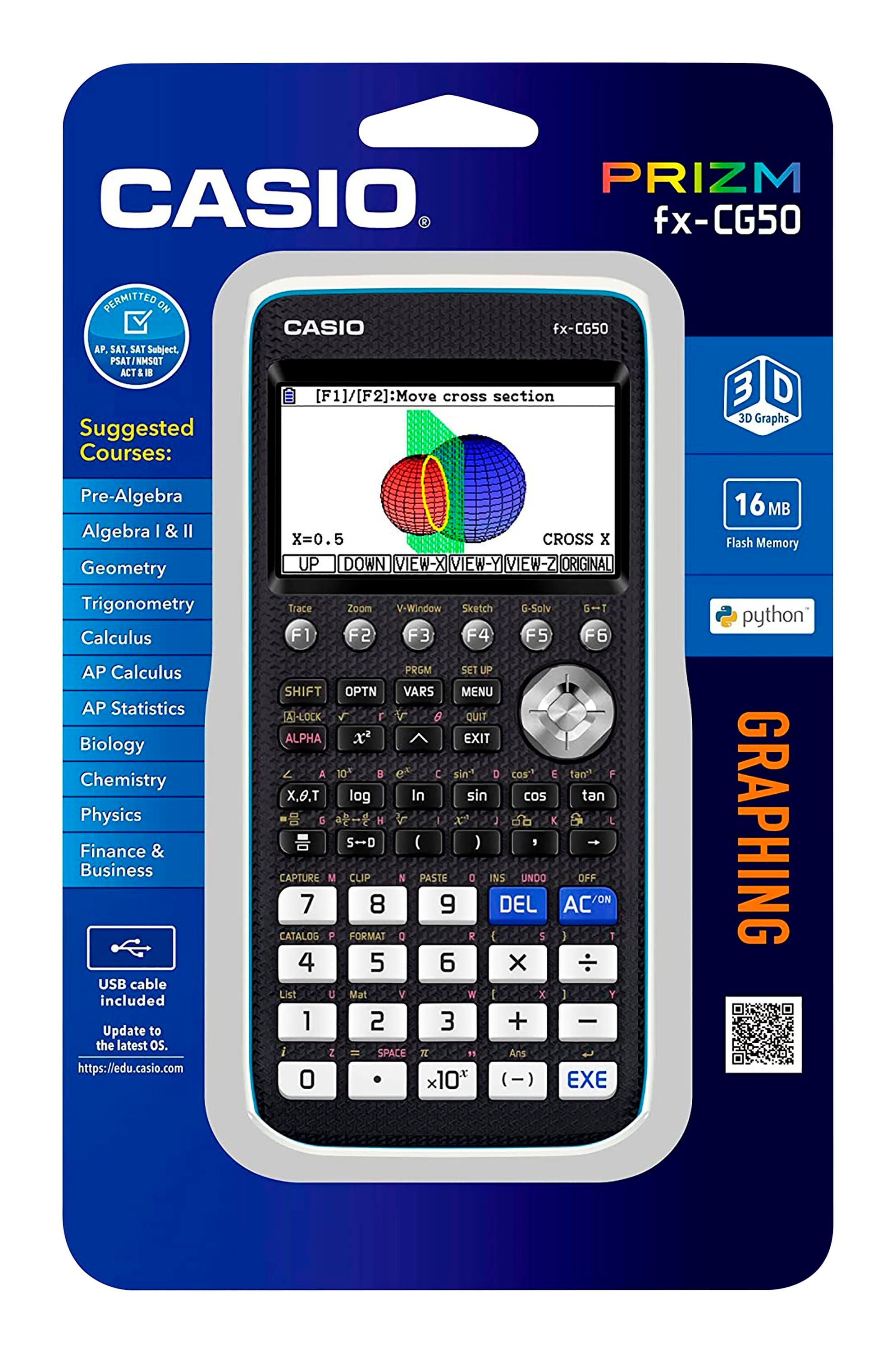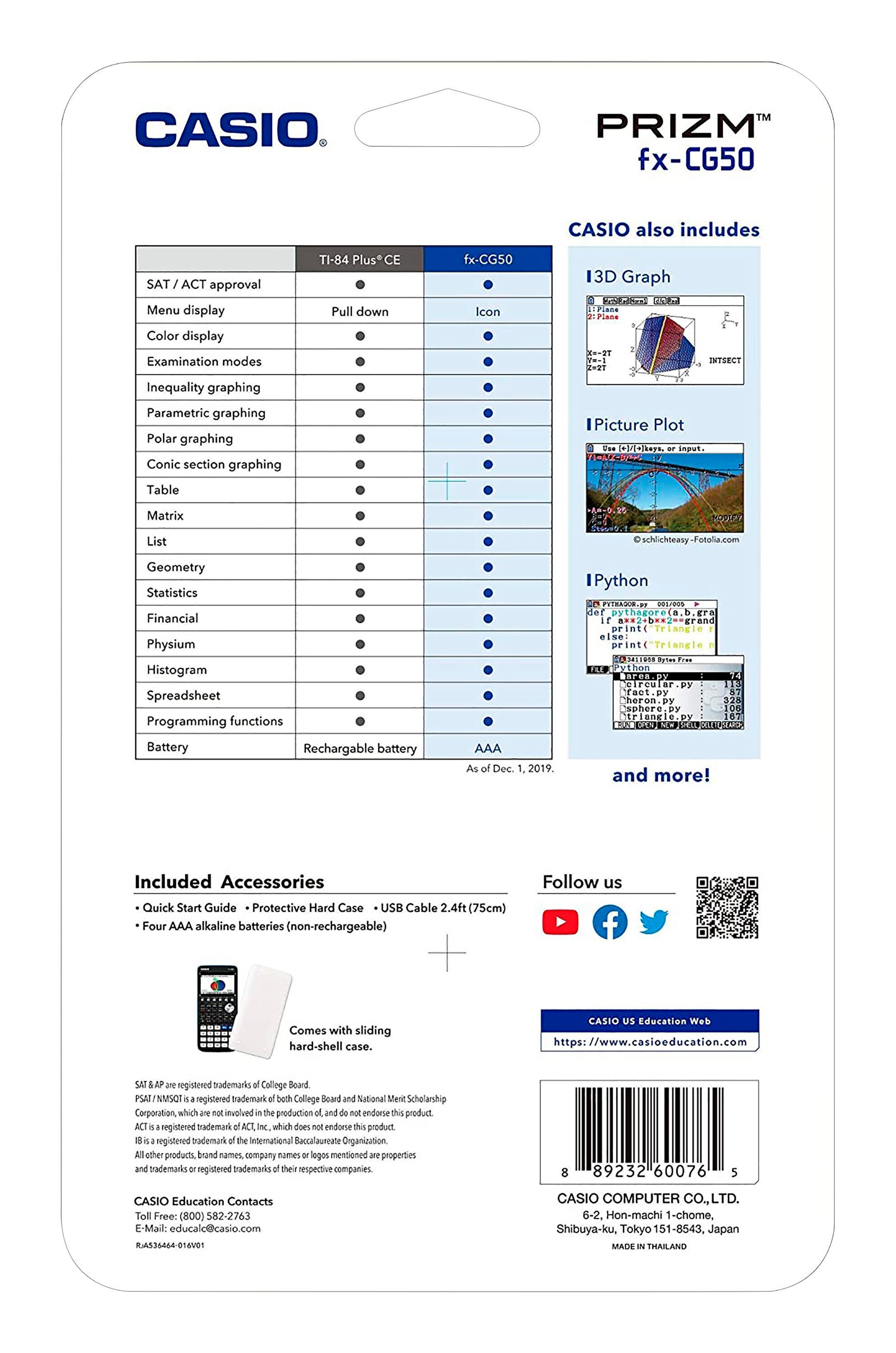 The FX-CG50LIH has a large high-resolution color display that offers basic mathematics, graphic representation, statistics, differential and integral calculus, programming, and financial mathematics. It features auto power off, backlit display, natural VPAM, prior entry recall, spreadsheet, 16 MB and 61 KB memory, 8 display lines with 21 characters and a display resolution of 216 x 384. Simple to connect to a PC as a USB mass storage device. Comes with a hard shell case.