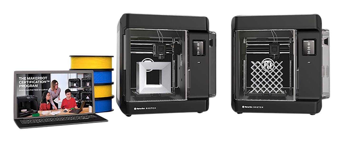 Meet the all-new Sketch Classroom, the comprehensive 3D printer solution designed to accelerate learning and design-thinking, 17 x 16-5/8 x 14-3/8 inches. Featuring a dual-printer set up, educators can offer the ideal student-to-printer ratio to drive 3D printing classroom success right from the start. With teacher and student certifications and more than 600+ lesson plans included, educators can integrate more interactive design projects and increase student engagement. Classroom 3D printer management is easier than ever with one queue management dashboard via MakerBot Cloud. Students can share design projects wirelessly and teachers can manage queues easily between printers.