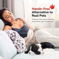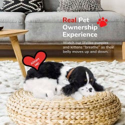 These adorable life-like animals offer a pet companionship experience that all ages can enjoy, without the hassle and responsibilities of caring for a real pet! Each pet "breathes" and their 100% synthetic fur is soft to stroke as they rest in your lap. Pets will breathe continuously for approximately 3-4 months by using the alkaline D battery (included) - possibly longer should you disconnect the battery between uses. No on-off switch. Clean only with a soft cloth lightly dampened with water to keep neat and tidy. Cocker spaniel plush measures 9-1/2 L x 7 W x 3 H inches. Carrier box measures 11 L x 7-3/4 W x 5 H inches when flat, and 11 L x 7-3/4 W x 9 H inches when tent is up. Bed measures 13 L x 10 W x 2 H inches.Features