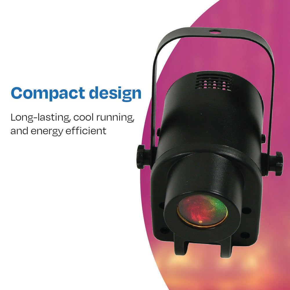 A compact, cool-running and maintenance-free spotlight! Create a completely unique light show from one single unit. The visual effect and speed of color changes can be easily adjusted using DIP switches underneath the unit. Choose one color light for constant use (6 options and white), or choose between several pre-programmed options for a more dynamic color-changing programs. Also compatible with Wi-Fi controllers. Spotlight has an angle-adjustable bracket and is for indoor use only. Measures approximately 7 W x 4-3/4 D x 4 H inches.
