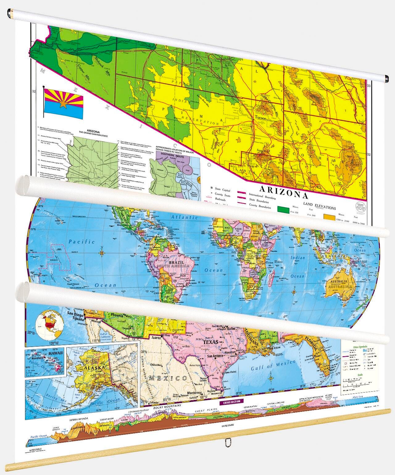 This large, colorful three-map set, mounted on a single roller, includes a state map, world map and United States map and is easy to read from across the room. The World and U.S. maps are political relief, with contrasting colors making countries and U.S. states immediately visible. The state map includes inset graphs and/or thematic maps providing information important to your state. The map set must be attached to the wall by means of a map rail or map rack (not included). Markable/erasable with water-soluble ink. Grades 4-12. Maps are 53 in H x 65 in W. Hardware to mount map is sold separately (1301145 for 1 Inch Map Rail or 285553 for 4-Map Rack).Features