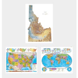 This large, colorful three-map set, mounted on a single roller, includes a state map, world map and United States map and is easy to read from across the room. The World and U.S. maps are political relief, with contrasting colors making countries and U.S. states immediately visible. The state map includes inset graphs and/or thematic maps providing information important to your state. The map set must be attached to the wall by means of a map rail or map rack (not included). Markable/erasable with water-soluble ink. Grades 4-12. Maps are 53 in H x 65 in W, Idaho map is 64h x 42 in W. Hardware to mount map is sold separately (1301145 for 1 Inch Map Rail or 285553 for 4-Map Rack).Features