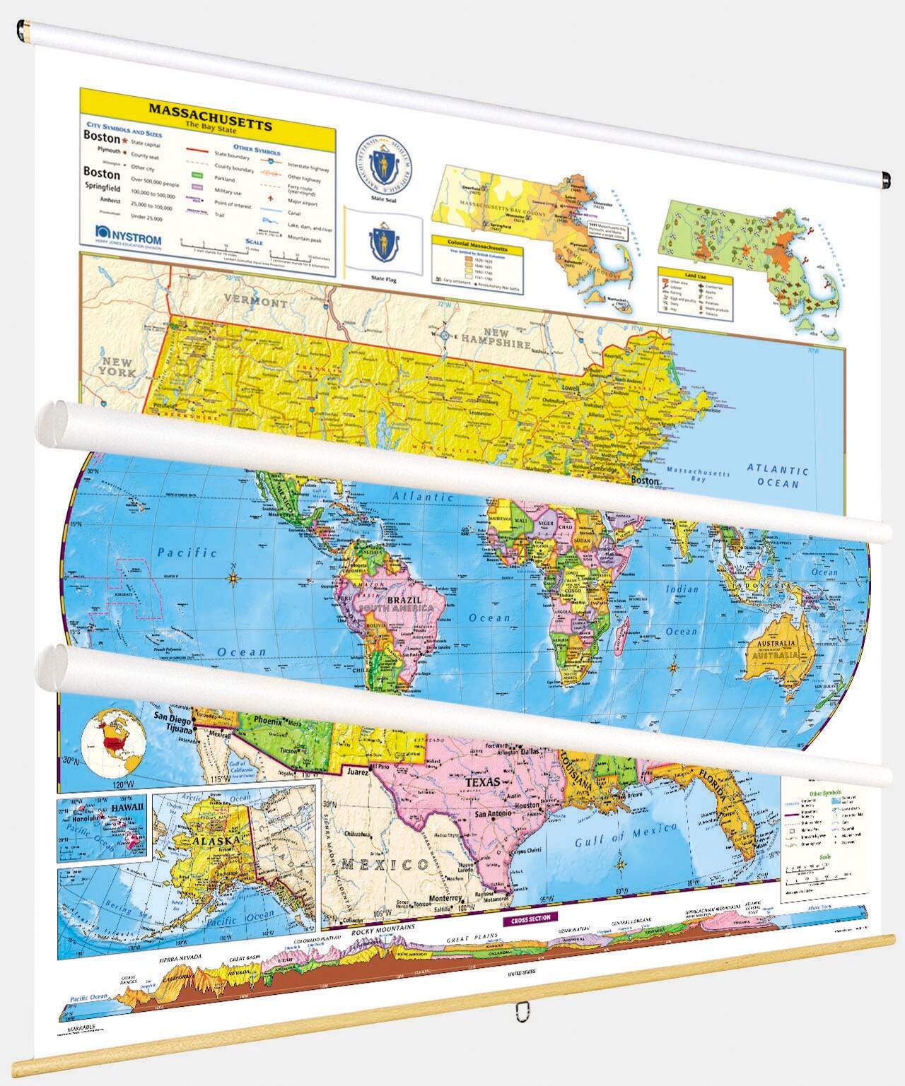 Social Studies MASSACHUSETTS/U.S./WORLD MAP COMBO, Markable, Erasable, Grades 4-12