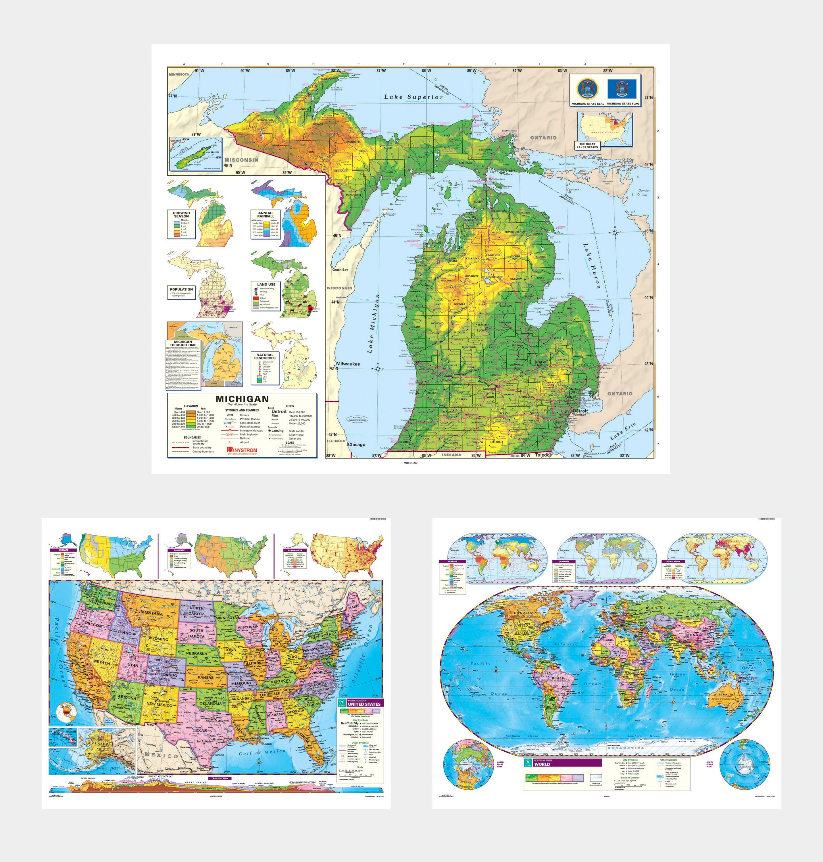 Social Studies MICHIGAN/U.S./WORLD MAP COMBO, Markable, Erasable, Grades 4-12