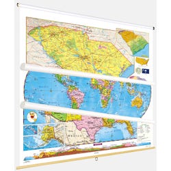 This large, colorful three-map set, mounted on a single roller, includes a state map, world map and United States map and is easy to read from across the room. The World and U.S. maps are political relief, with contrasting colors making countries and U.S. states immediately visible. The state map includes inset graphs and/or thematic maps providing information important to your state. The map set must be attached to the wall by means of a map rail or map rack (not included). Markable/erasable with water-soluble ink. Grades 4-12. Maps are 53 in H x 65 in W. Hardware to mount map is sold separately (1301145 for 1 Inch Map Rail or 285553 for 4-Map Rack).Features
