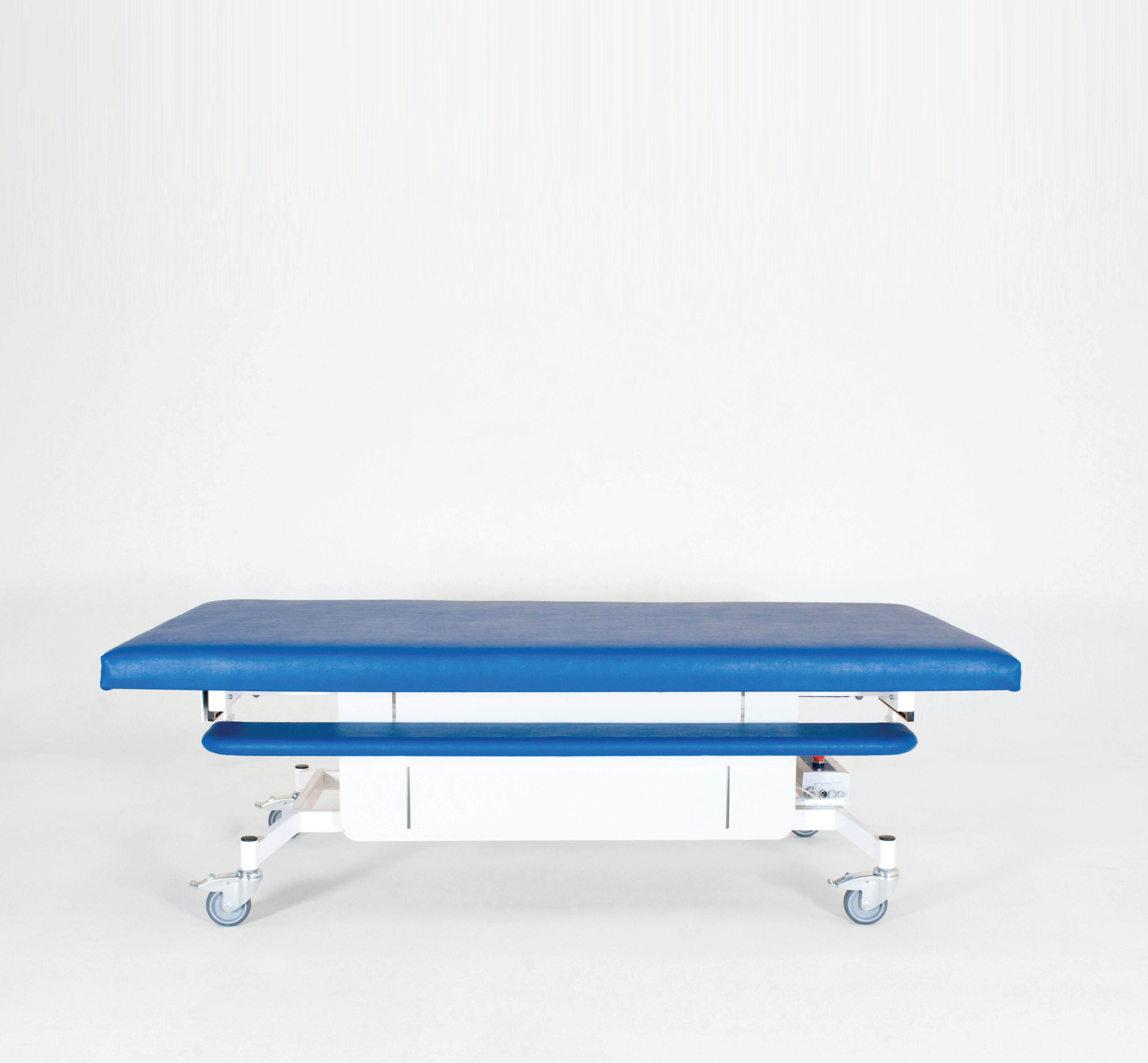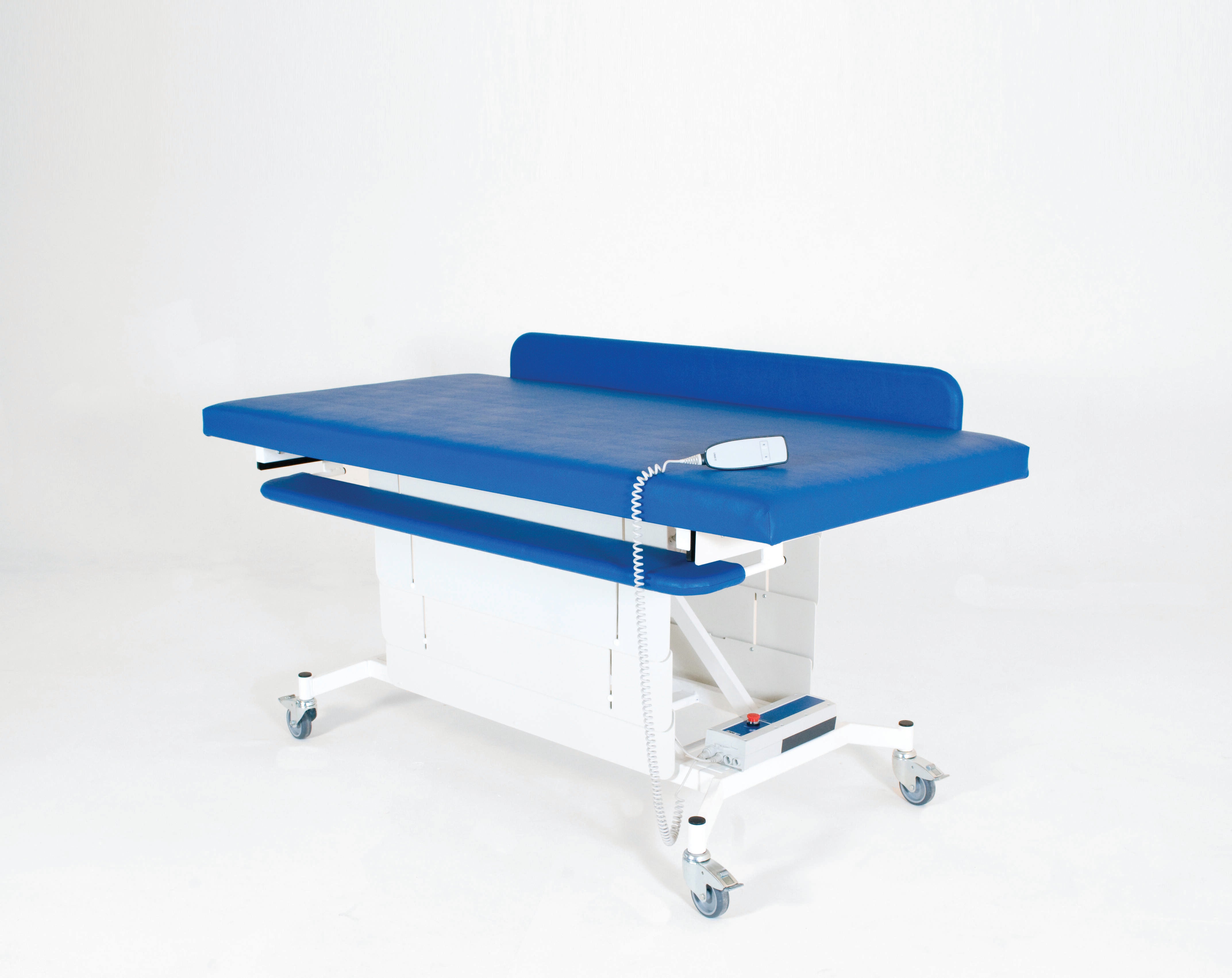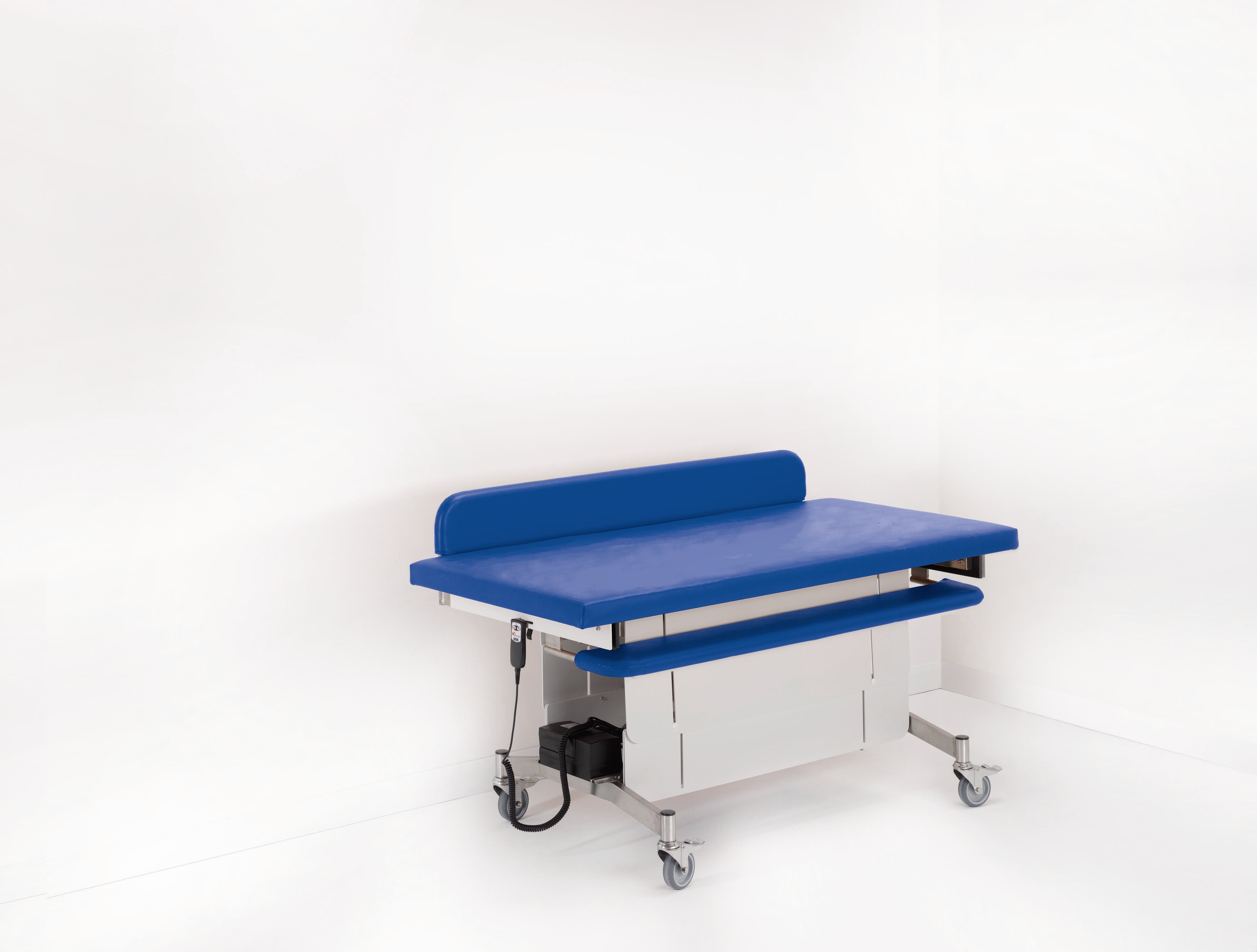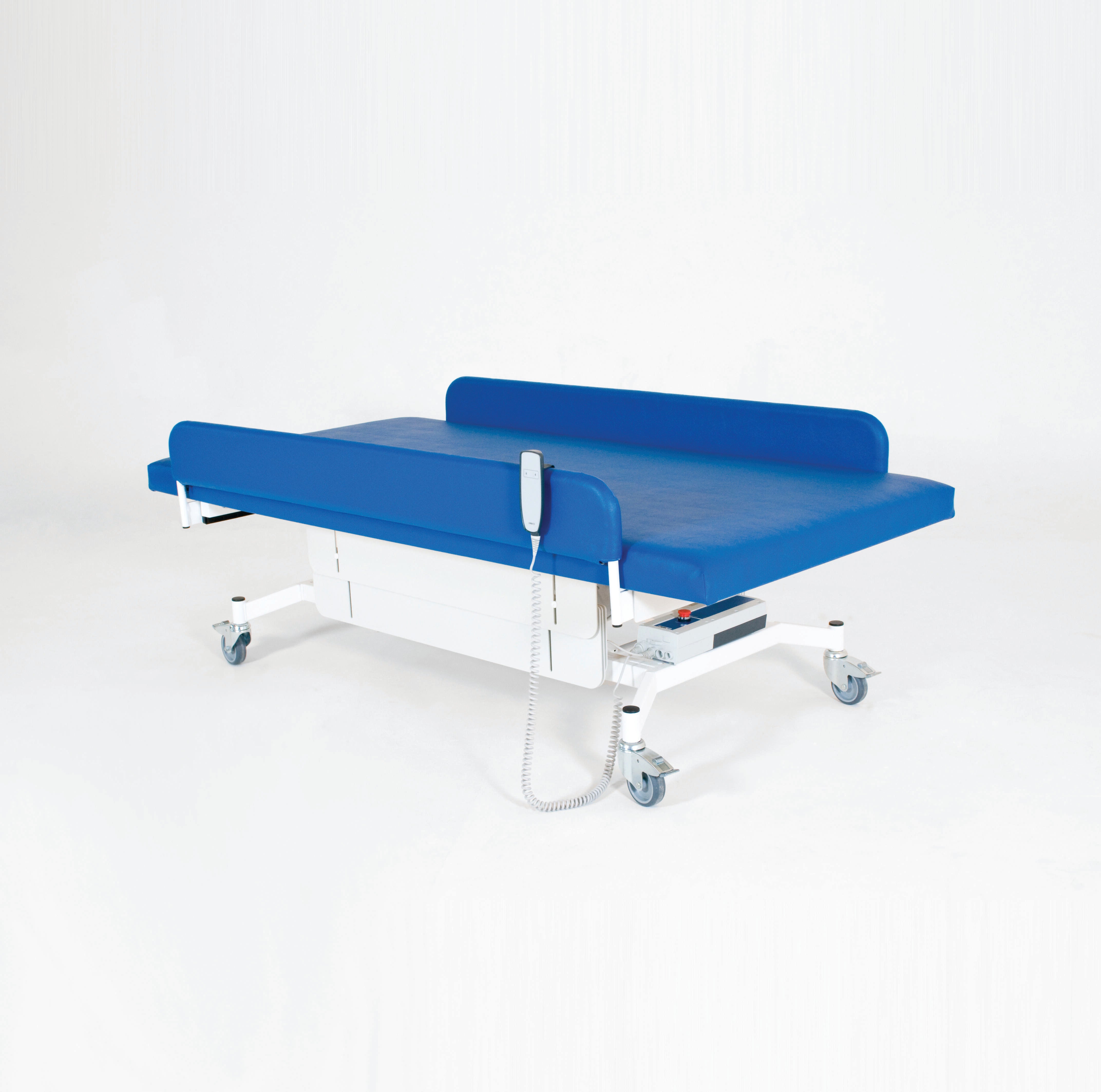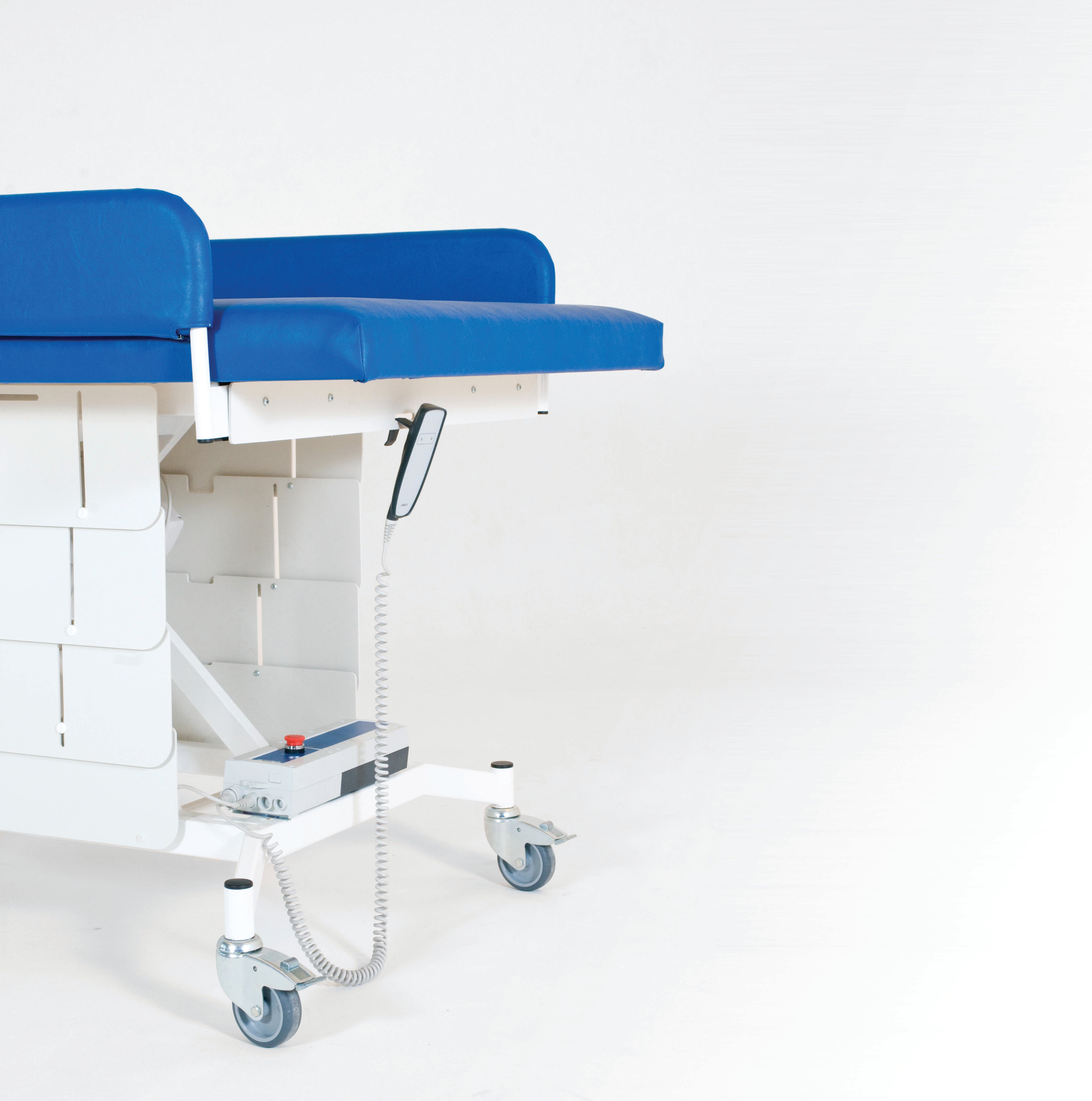 Adjustable height is triggered by the touch of a button, allowing for a more seamless caretaker experience