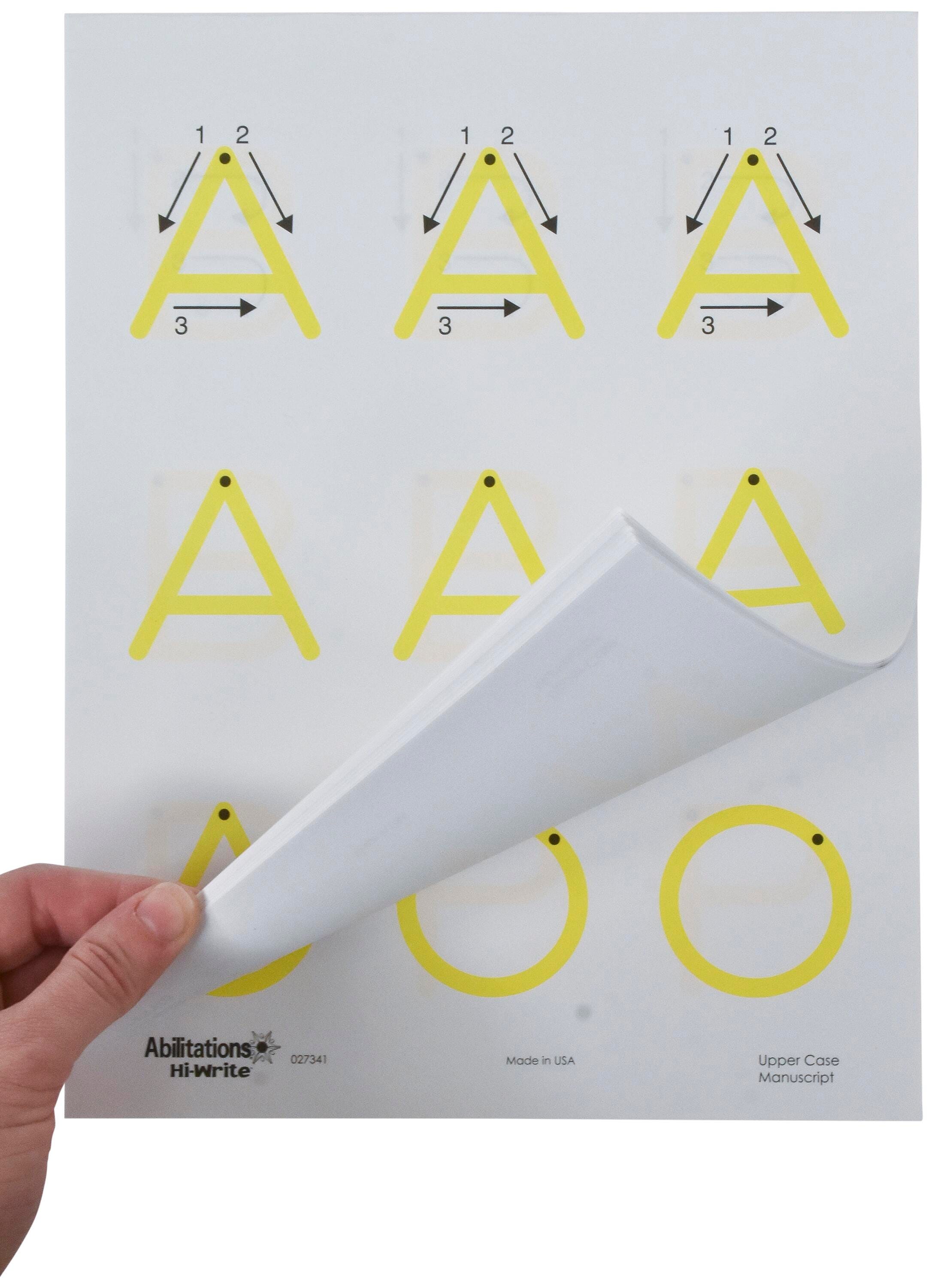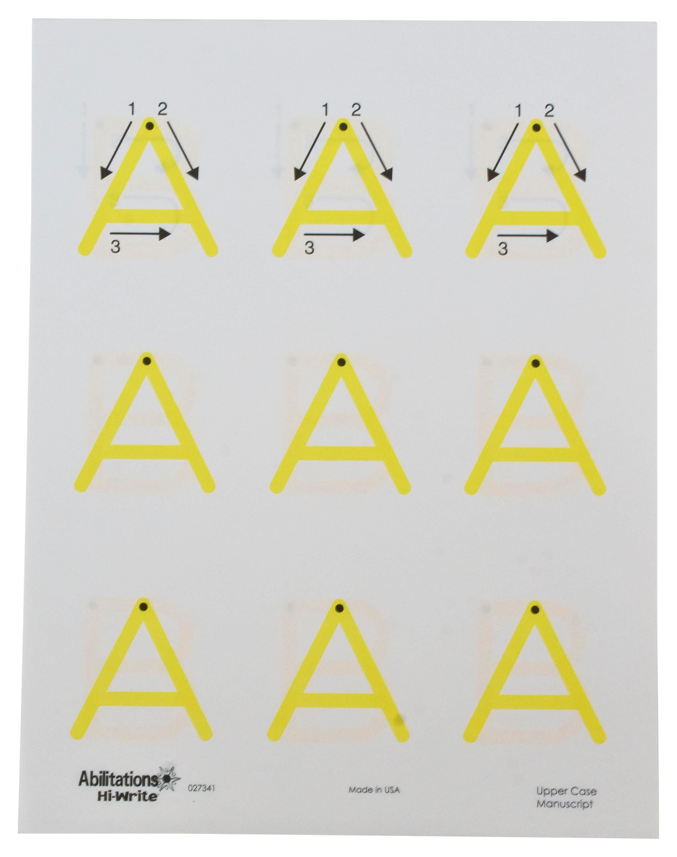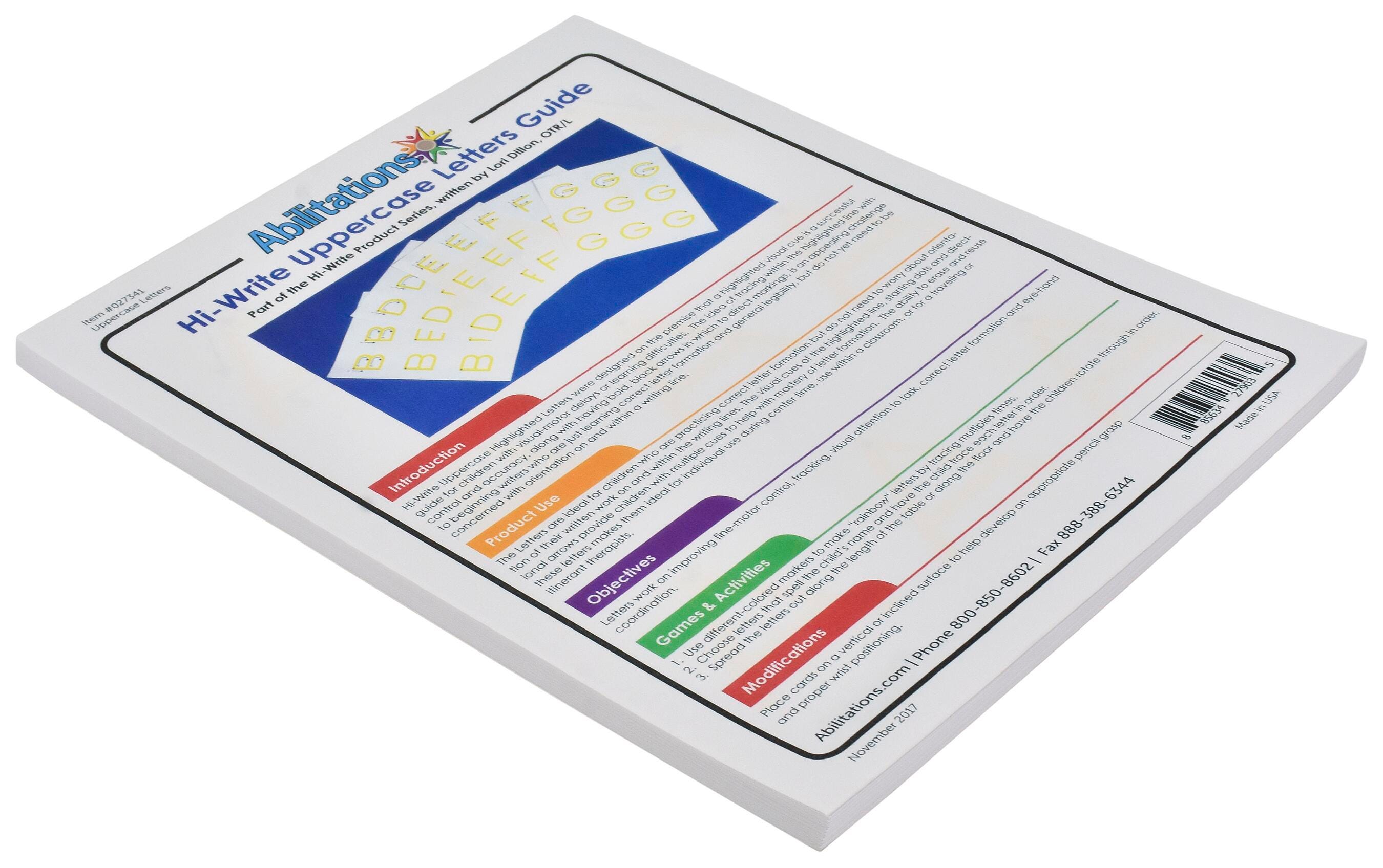 Abilitations Hi-Write uppercase alphabet paper helps improve fine motor control, legibility, and quality of written work. The paper has highlighted uppercase letters with directional arrows for correct letter formation, and can be placed on a slant board for improved visual orientation and proper wrist positioning (sold separately). The paper is versatile for use in one-on-one or small group therapy sessions, handwriting instruction, and independent writing time. The pack contains 104 sheets measuring 8-1/2 x 11 inches, with four sheets of each letter for practice. May be suitable for special needs, early childhood, and elementary learning environments. Includes an activity guide with suggestions for use.Features
