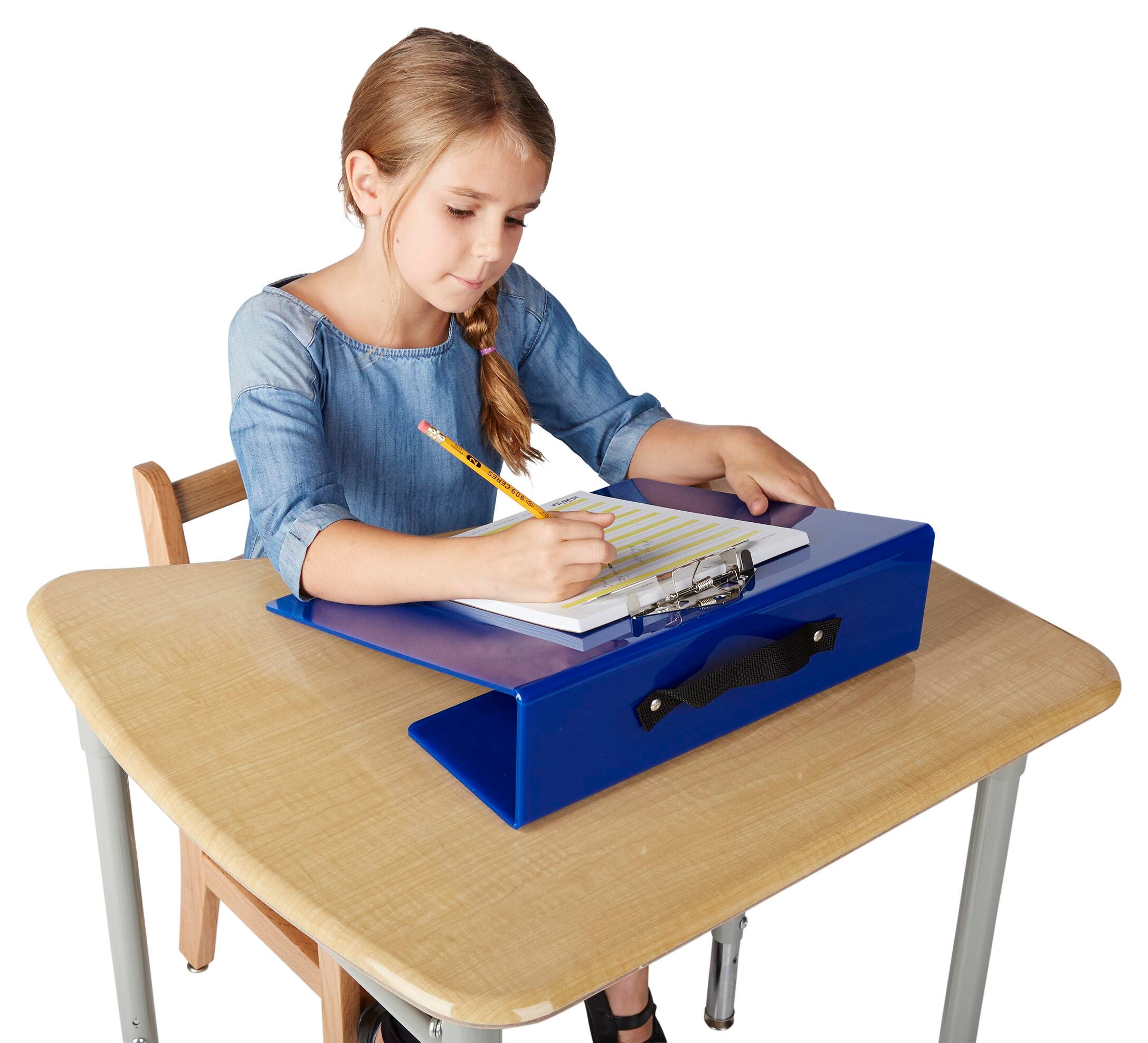 Working at an angle with a book or writing paper promotes the development of proper hand and wrist position for handwriting and fine-motor skills, as well as good visual tracking. Features a low angle (20 degree) and is made of light-weight Plexiglas. Encourages better posture and positioning for writing or reading. SlantScript measures 14 H x 15 W inches, with large metal clip to hold paper and non-slip discs to prevent sliding. Dark Blue.Features