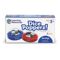 From board games and activity sets to math lessons, Dice Poppers helps everyone participate. The durable plastic poppers keep dice contained and help users roll with ease. Set includes 2 distinct poppers. The red popper features a single die numbered 1 to 6, while the blue popper comes with a pair of 6-sided dot dice. Each popper measures 3-3/8 x 3-3/8 x 2 inches. Ages 3 and up.Features